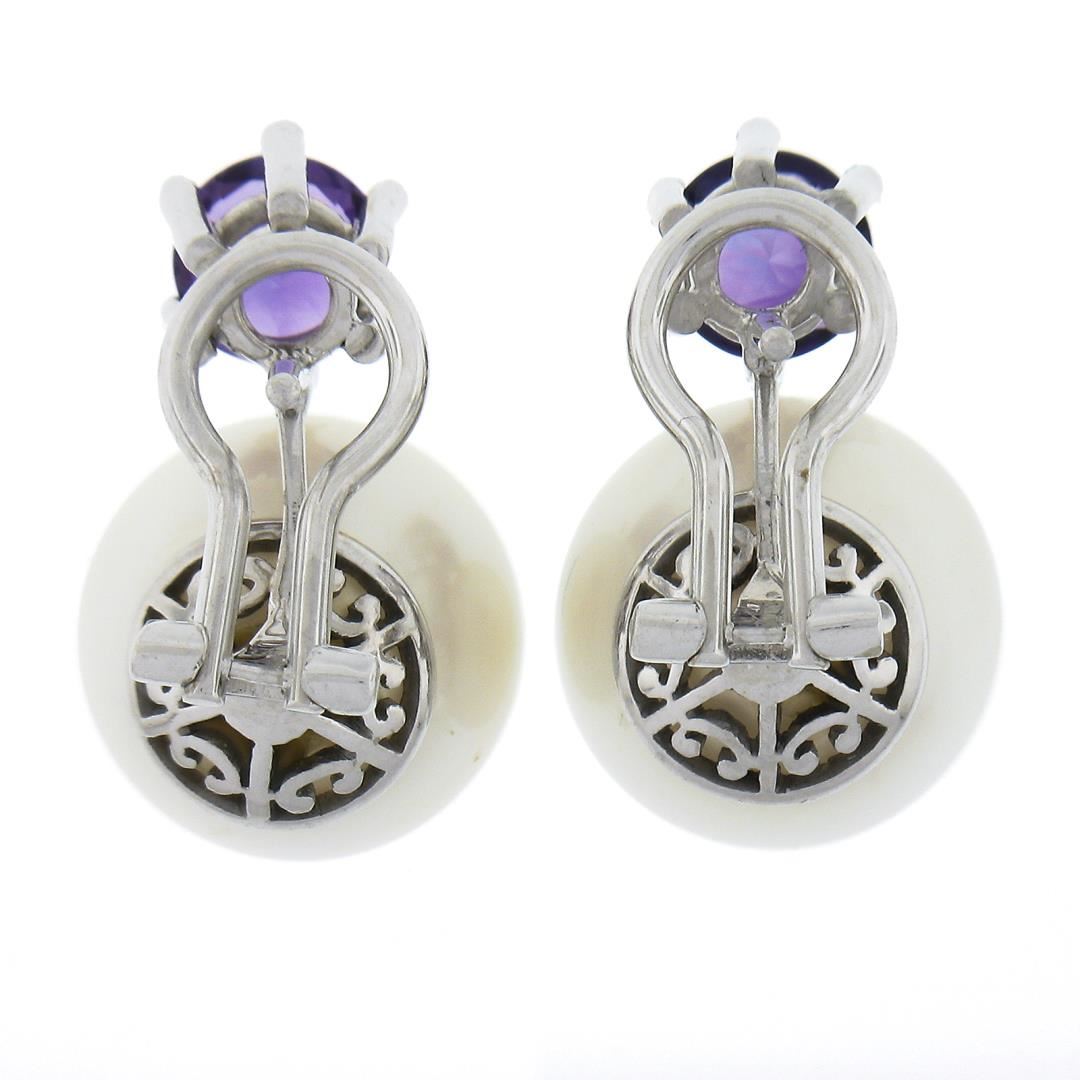 A vintage solid 18k white gold earrings, with 2 round shape cultured pearls (14mm), and 2 round cut natrual amethysts (1.87ctw). The earrings measure approximately 23.4x14mm and weigh a total of 14.62 grams.