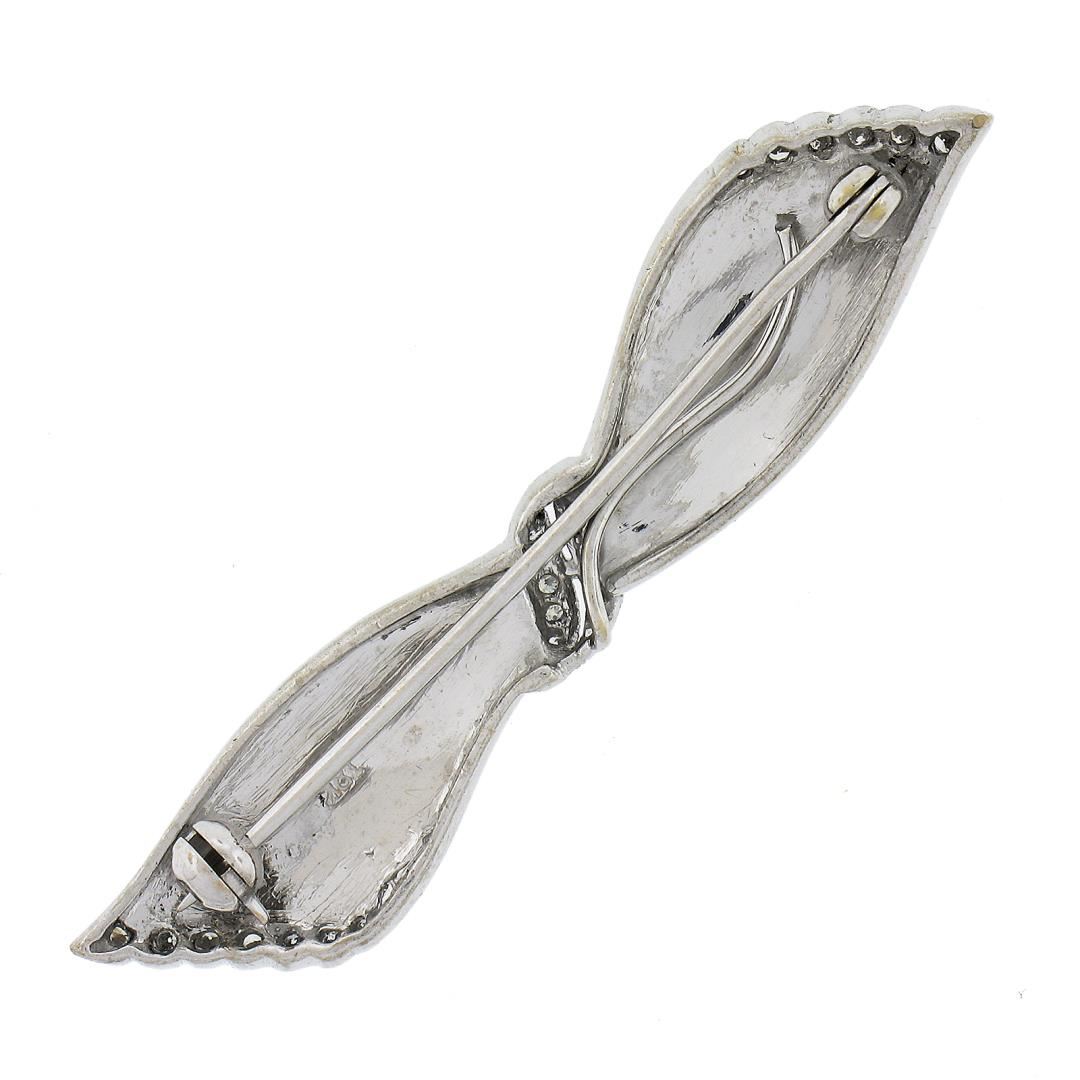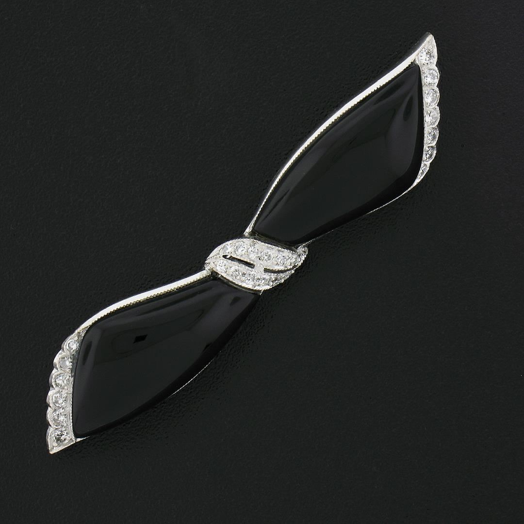 A vintage solid 18k white gold bow brooch, with 2 custom cut natural black onyx , and 25 round cut natural diamonds (G/H - VS2 /SI1 ; 0.30ctw ). Measures 49.97x10mm and weighs a total of 7.88 grams.