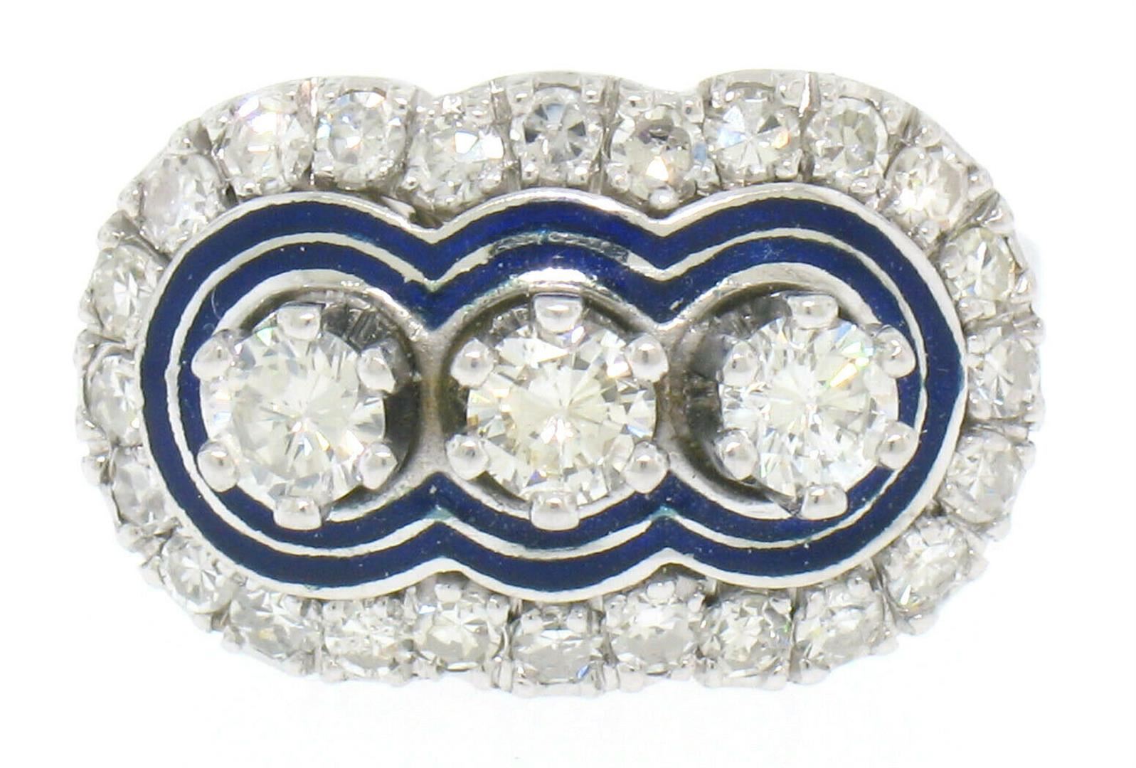 A like new vintage 18k white gold ring with 1.15ctw of round diamonds (G - VS2) and blue enamel. The ring is size 6.5, weighs a total of 6.1 grams, and the top measures approximately 19.53x12.58mm.