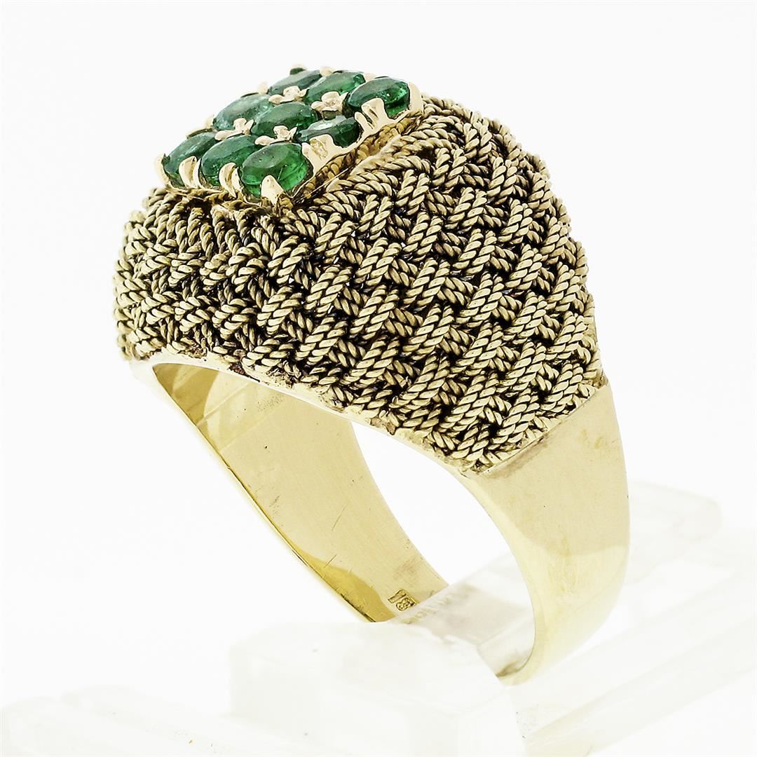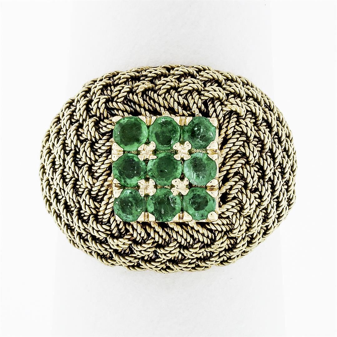 A solid 18k yellow gold dome ring, with 9 round cut natural emeralds (0.72ctw). The ring is size 7.0, weighs a total of 7.67 grams, and measures 16.06mm wide.