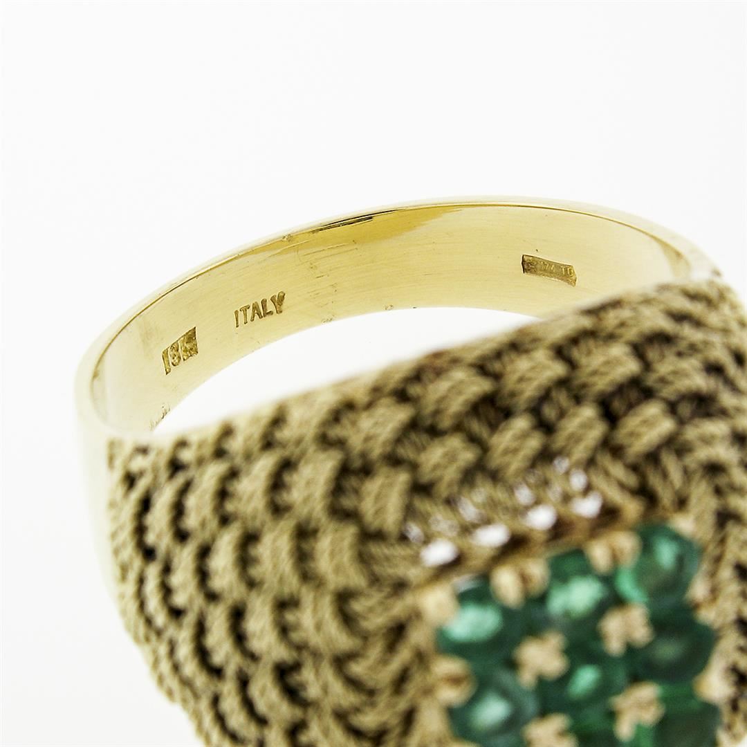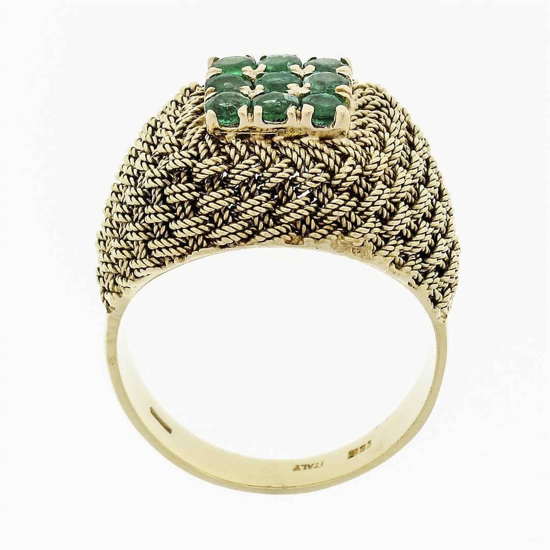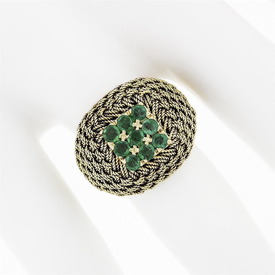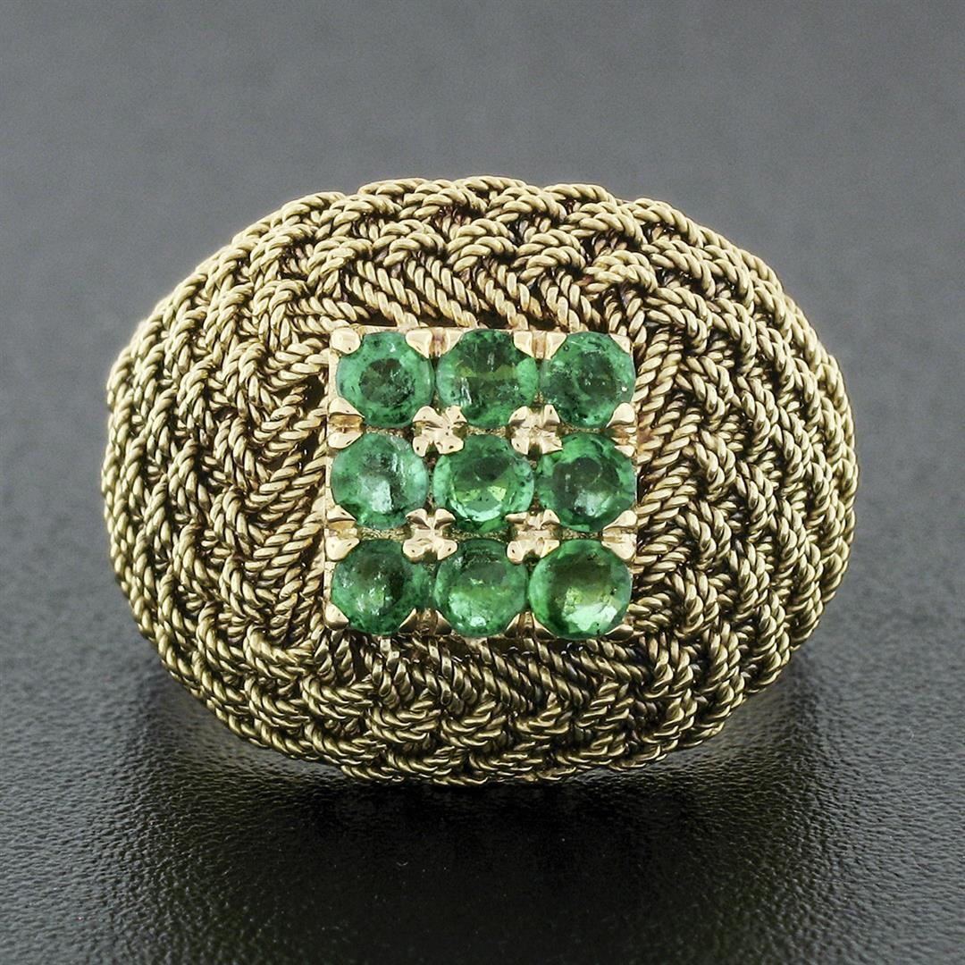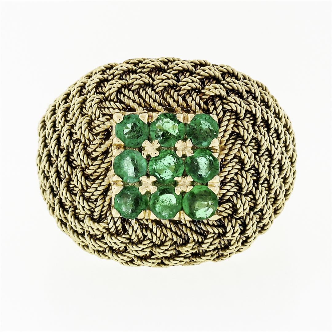 A solid 18k yellow gold dome ring, with 9 round cut natural emeralds (0.72ctw). The ring is size 7.0, weighs a total of 7.67 grams, and measures 16.06mm wide.
