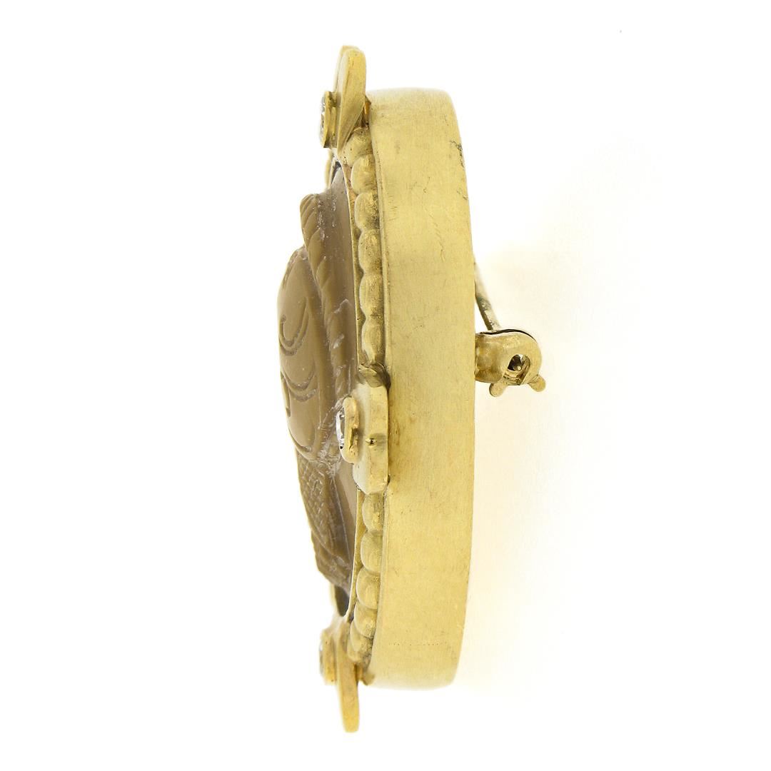 A vintage solid 18k yellow gold brooch, with 1 cameo hardstone (25x19mm), and 4 round cut natural diamonds (G/H - VS2/SI1 ; 0.22ctw ). Measures 37.8x32.3mm and weighs a total of 21.89 grams.