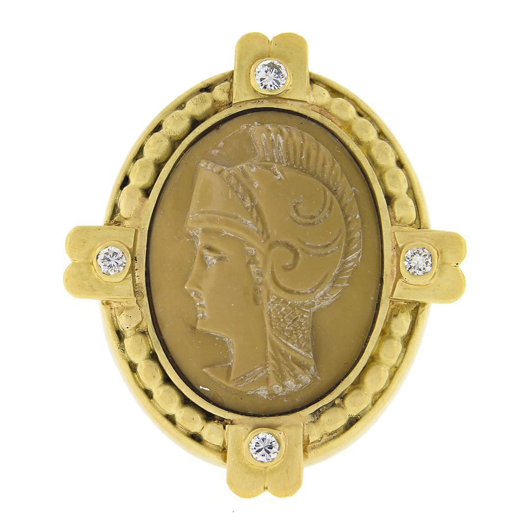 A vintage solid 18k yellow gold brooch, with 1 cameo hardstone (25x19mm), and 4 round cut natural diamonds (G/H - VS2/SI1 ; 0.22ctw ). Measures 37.8x32.3mm and weighs a total of 21.89 grams.