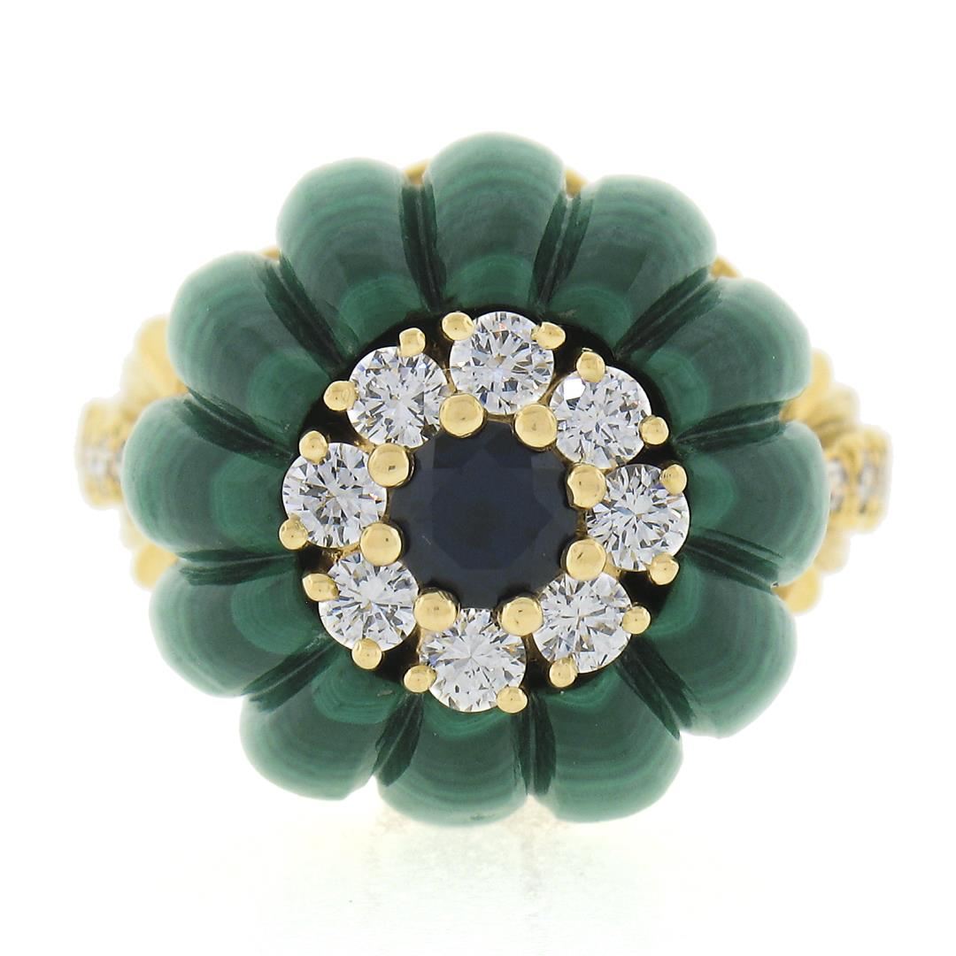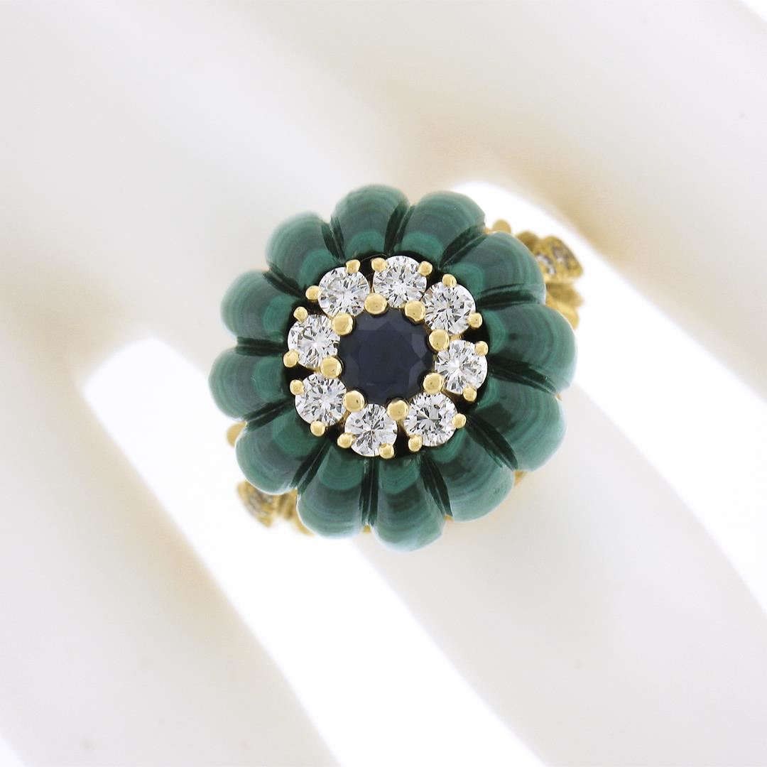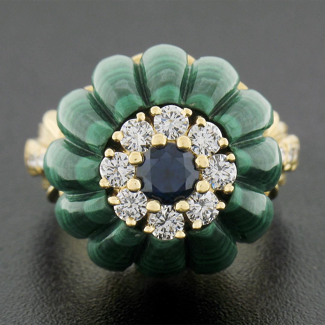 Vintage 18k Yellow Gold Carved Malachite w/ Diamond & Sapphire Statement Ring