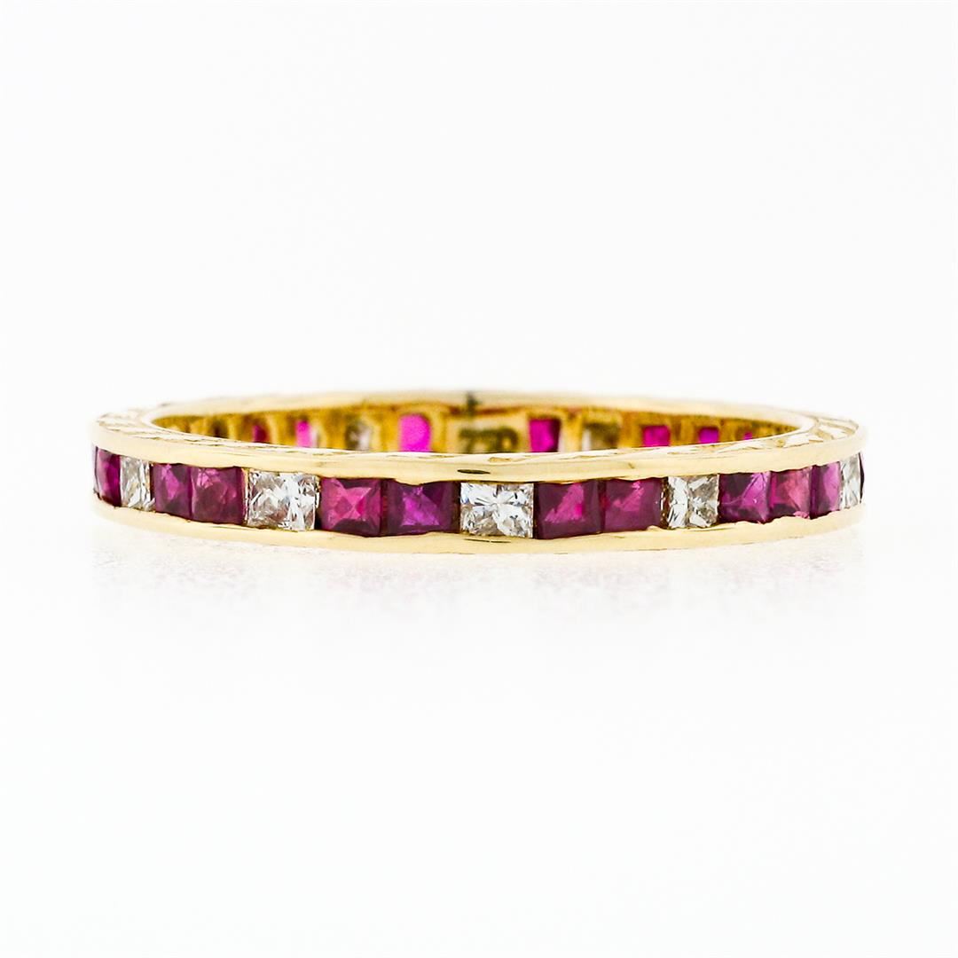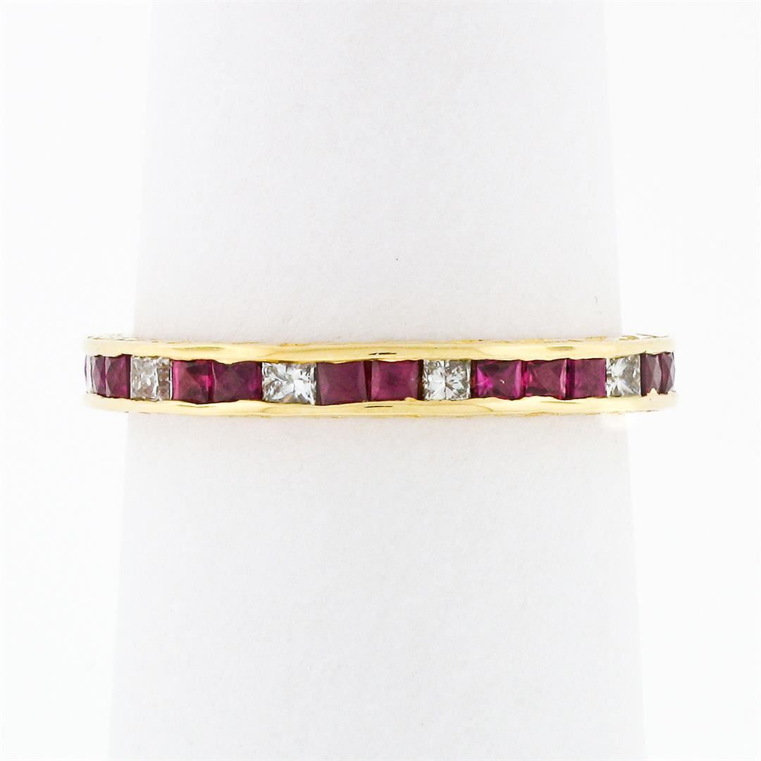 A vintage 18k yellow gold stackable band ring with 24 natural rubies (0.80ctw) and 10 natural diamonds (H/I - VS1/VS2; 0.30ctw). The ring is size 6.0, weighs a total of 1.87 grams, and measures 2.5mm wide.