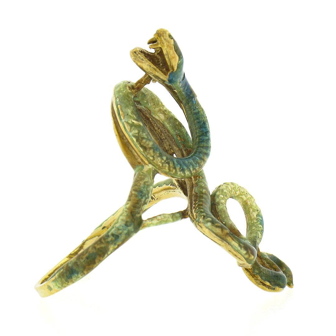 A vintage solid 18k yellow gold with blue & green enamel work snake ring.The ring is size 7.5, weighs a total of 6.08 grams, and measures 27.8mm wide.