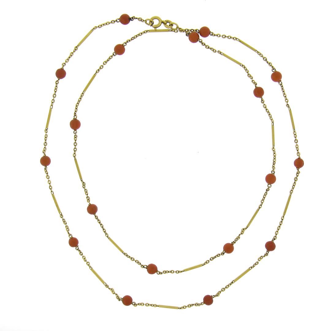 A vintage solid 18k yellow gold station link necklace, featuring 18 bead shape natural corals (5.1mm each). It weighs a total of 10.33 grams, measures 5.1mm wide, and measures 30 inches in length.