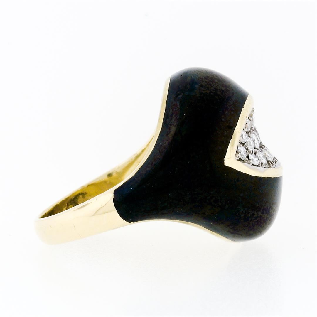 A vintage solid 18k yellow gold cocktail ring, with black enamel work and 19 round brilliant cut natural diamonds (G/H - VS1/VS2 ; 0.55ctw). The ring is size 6, weighs a total of 9.62 grams, and measures 18.50mm wide.