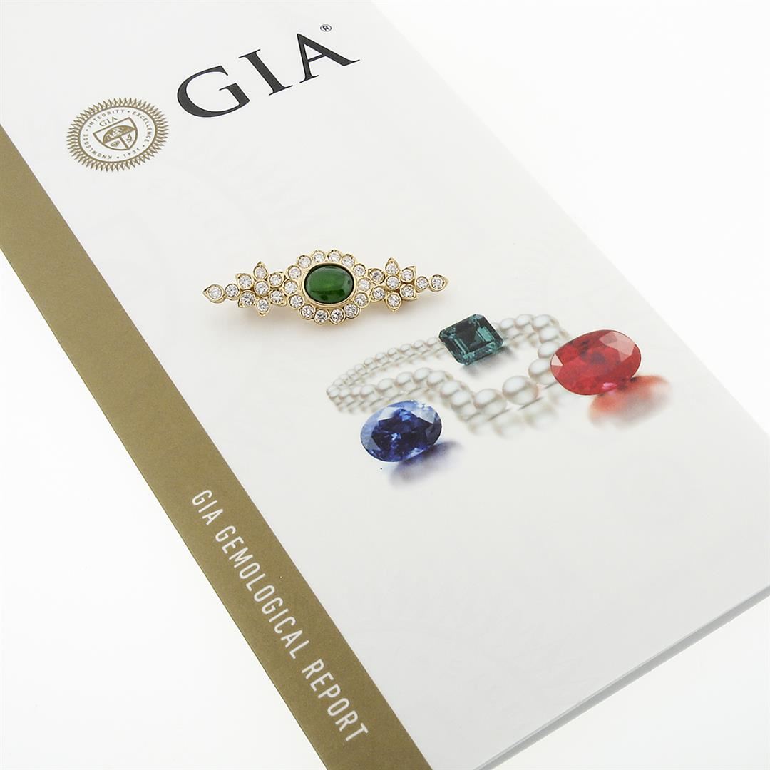 A vintage solid 18k yellow gold pin brooch, with 1 Gia certified oval cabochon cut natural jade (8.80 x 6.90 x 2.19 mm), and 32 round brilliant cut natural diamonds (G- VVS2/VS1; 1.90ctw). Measures 13.5x43.2mm and weighs a total of 5.23 grams. Comes with all original relevant certifications.