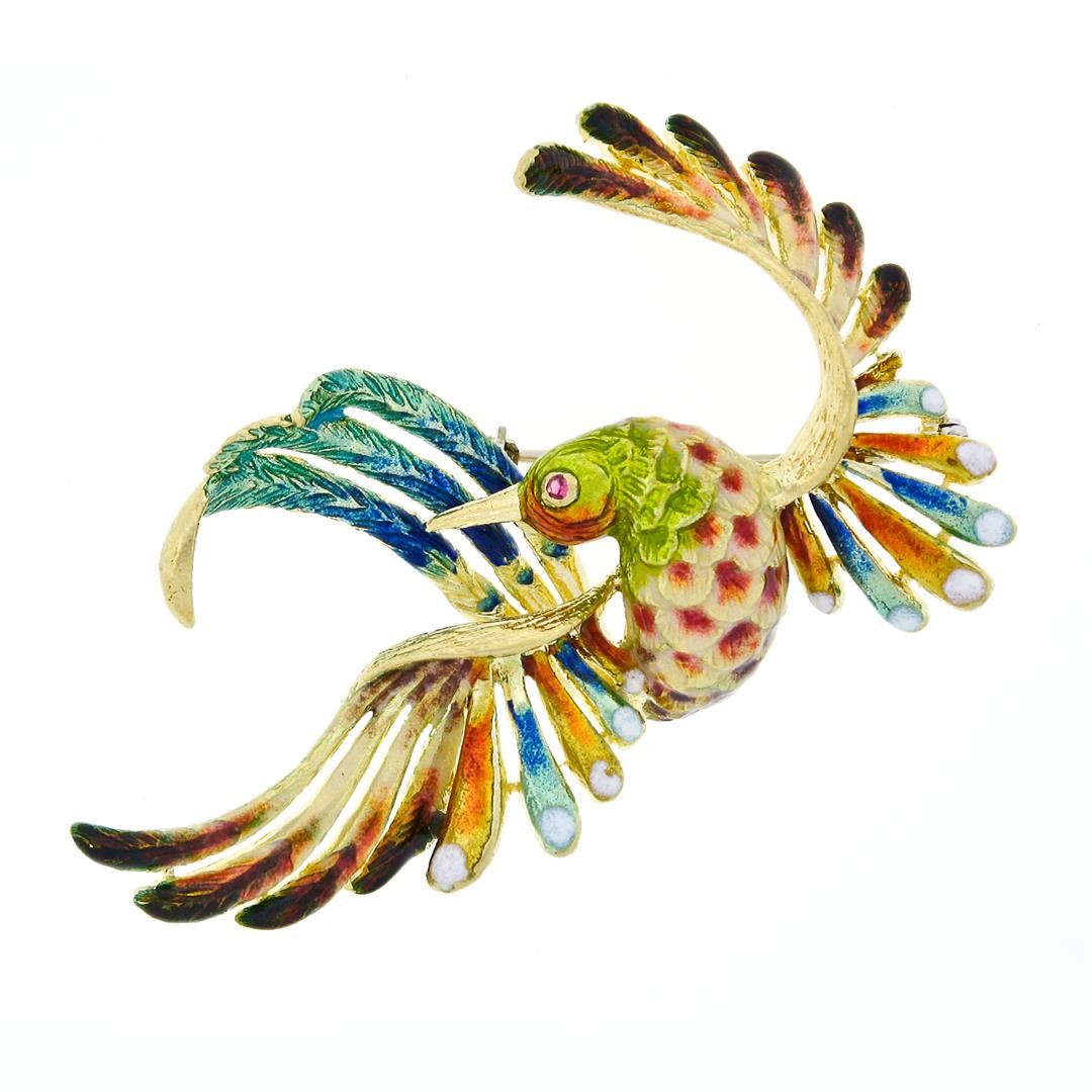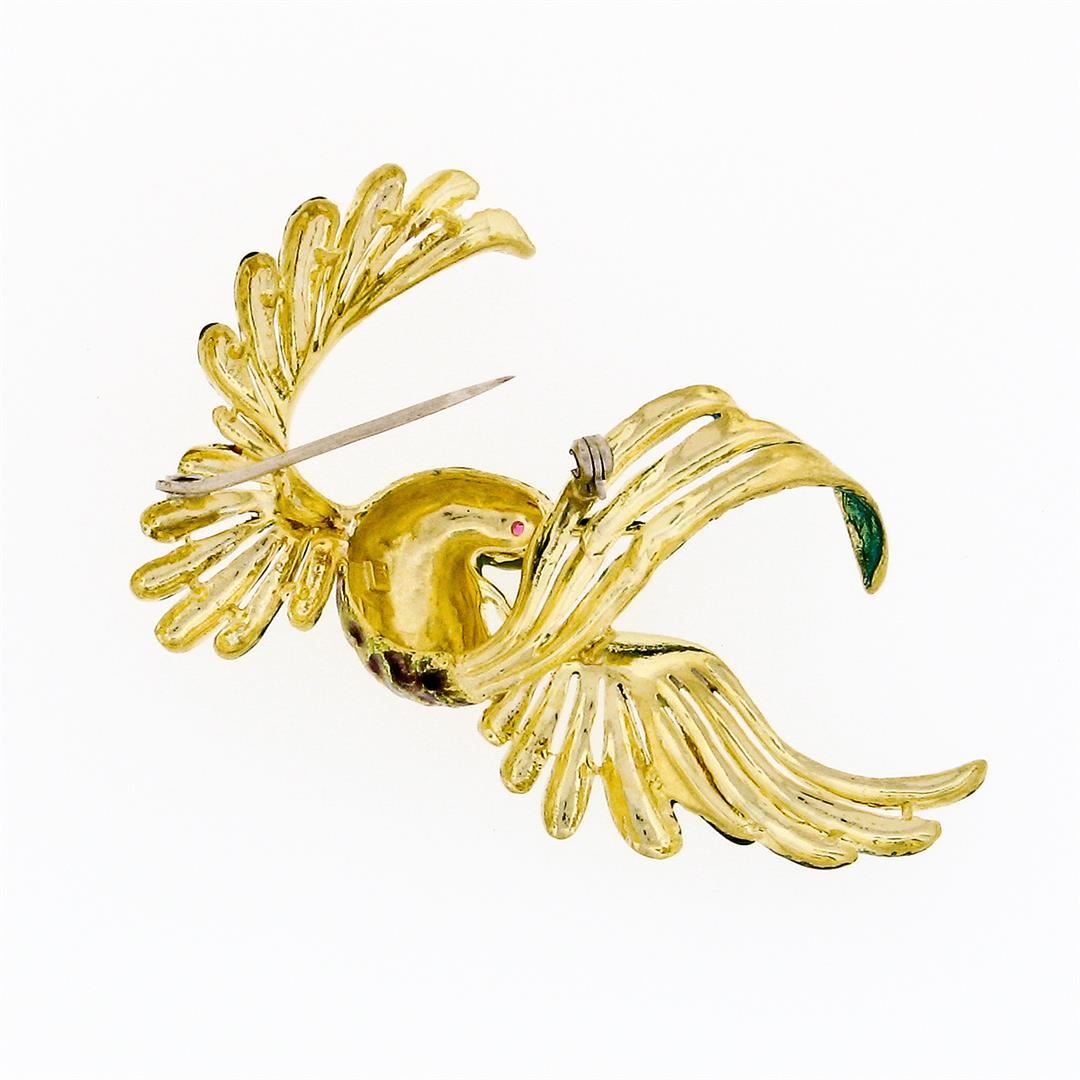 A vintage solid 18k yellow gold flying peacock pin brooch, with multicolor enamel work and 1 round brilliant cut natural diamond (0.03ctw). Measures 50x56.6mm and weighs a total of 19.39 grams.