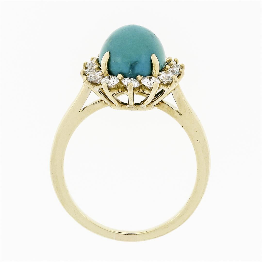 A solid 18k yellow gold ring, with 1 oval cabochon cut natural turquoise (11.1x8.5mm ), surrounded with a halo of 14 round brilliant cut natural diamonds (E/F - VVS2/VS1 ; 0.70ctw). The ring is size 6.5, weighs a total of 4.74 grams, and measures 15.5mm w