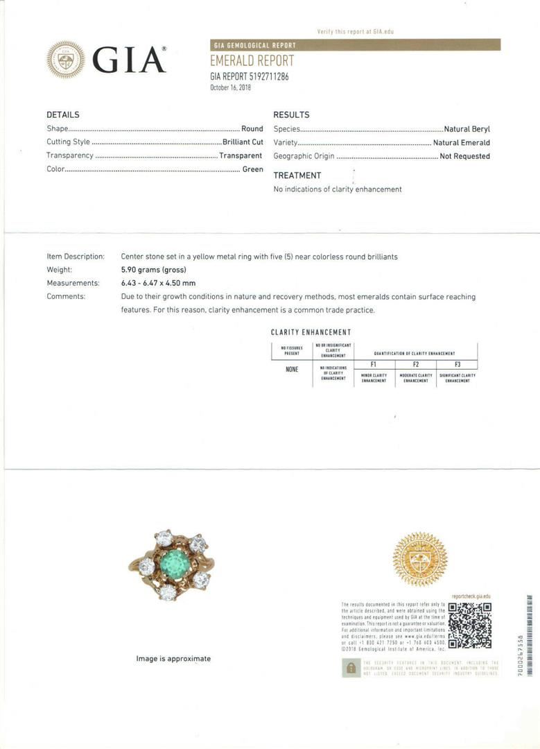 A vintage solid 18k yellow gold flower ring, with 1 GIA Certified round brilliant cut natural emerald (6.43 to 6.47 ; 0.93ct), surrounded with 5 round brilliant cut natural diamonds (G/H - VVS2/VS1 ; 1.10ctw). The ring is size 6.5, weighs a total of 5.93 grams, and measures 15.86mm wide. Comes with all original relevant certifications.