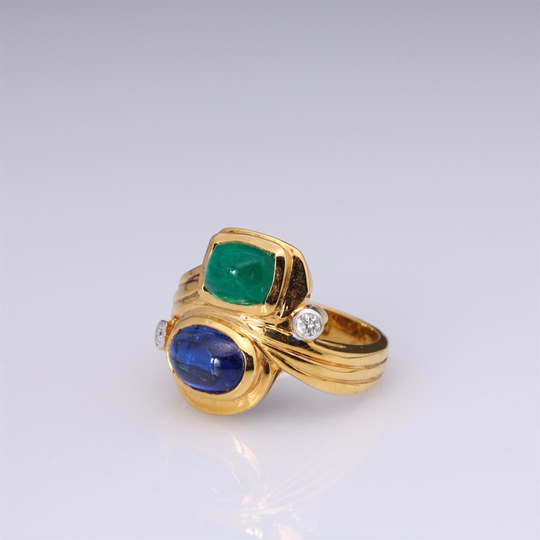 Vintage 18k yellow gold sugarloaf emerald and sapphire ring with two diamond accents; marked 18k to interior band; gross weight 8.1 g, size 7 1/4