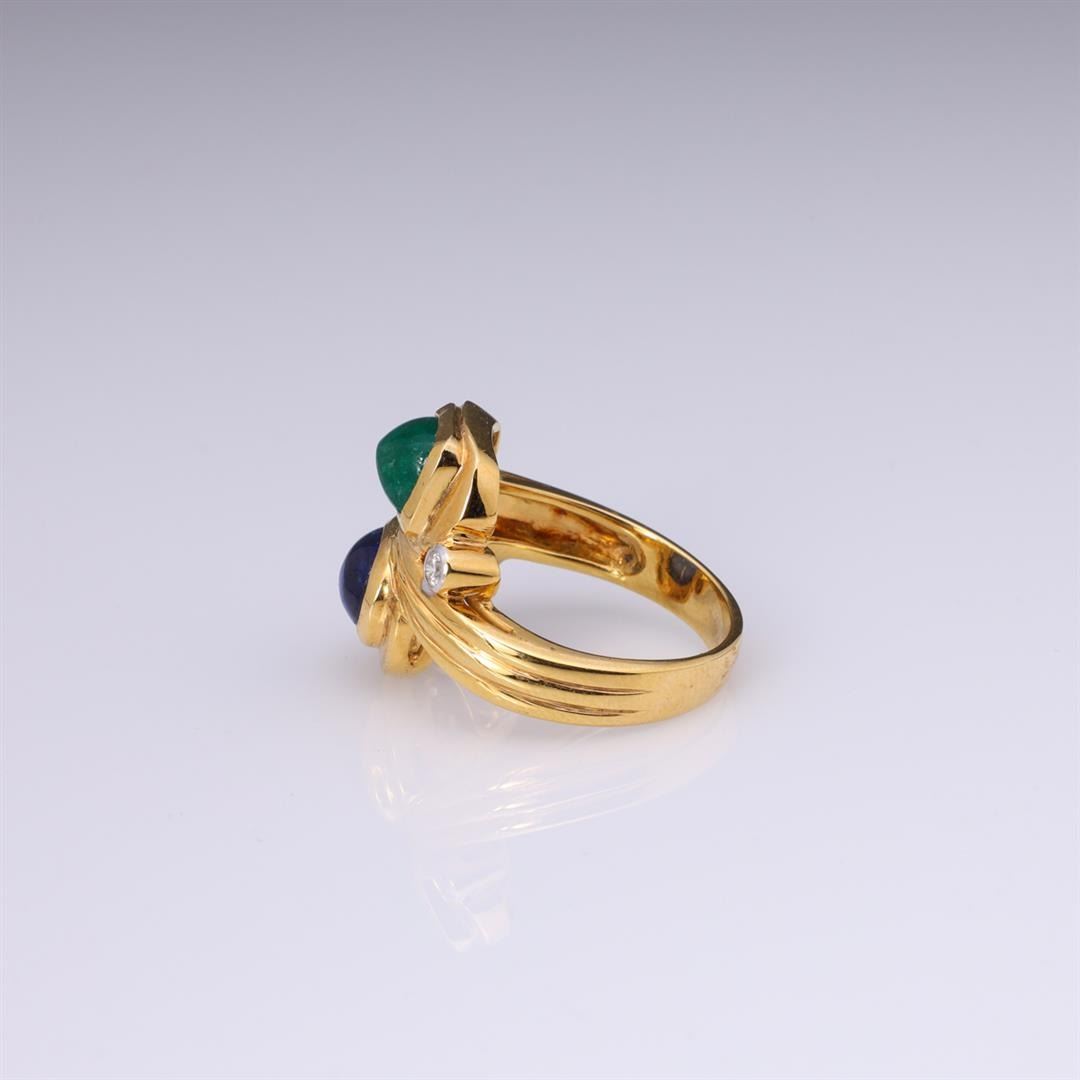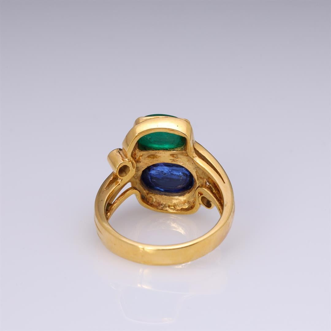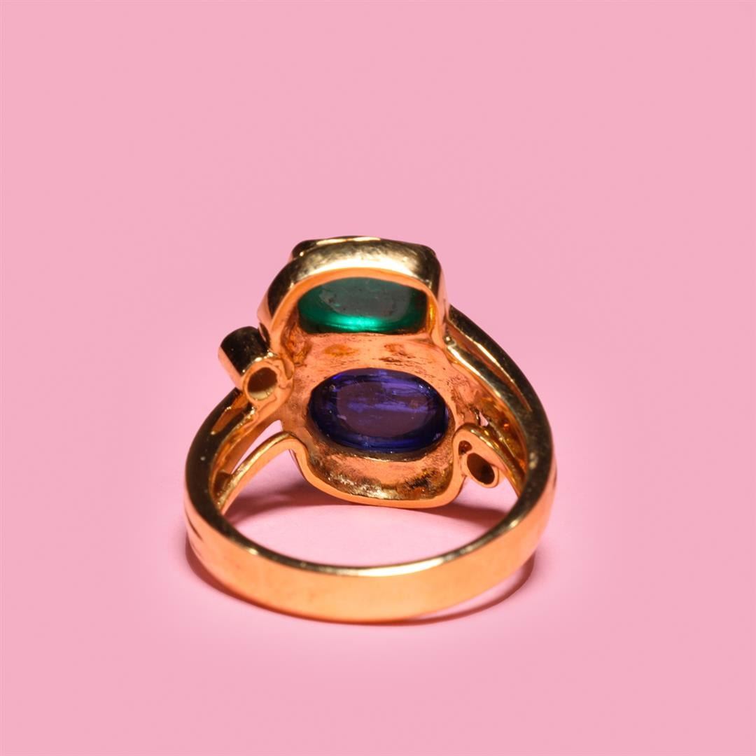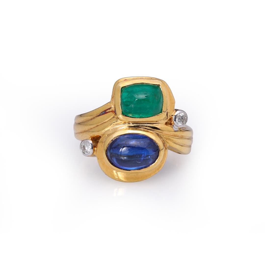 Vintage 18k yellow gold sugarloaf emerald and sapphire ring with two diamond accents; marked 18k to interior band; gross weight 8.1 g, size 7 1/4
