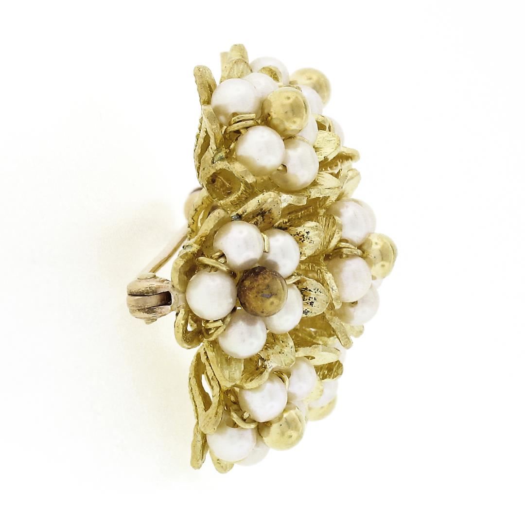 A vintage solid 18k yellow gold cluster brooch, with 35 of round shape cultured pearls (3mm each). Measures 26.5x28mm and weighs a total of 9.21 grams.