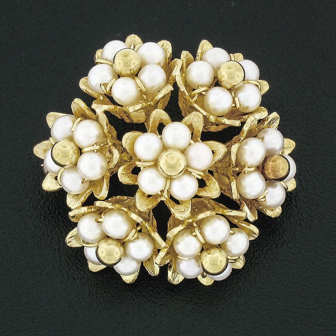 A vintage solid 18k yellow gold cluster brooch, with 35 of round shape cultured pearls (3mm each). Measures 26.5x28mm and weighs a total of 9.21 grams.
