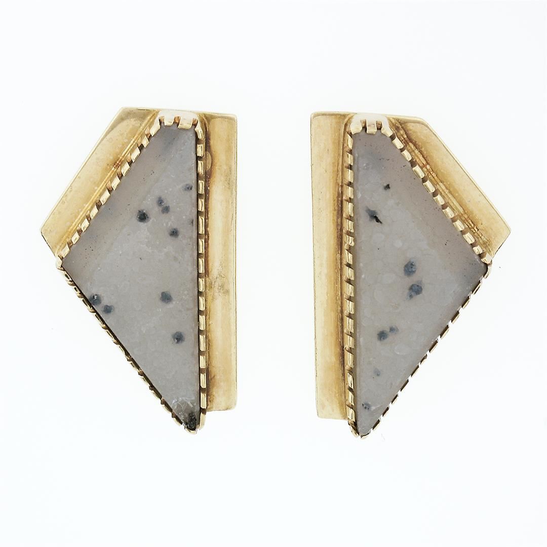 A vintage solid 18k yellow gold geometric earrings, with 2 natural agate (22.45x9.4mm). The earrings measure approximately 23.9x14.4mm and weigh a total of 7.72 grams.