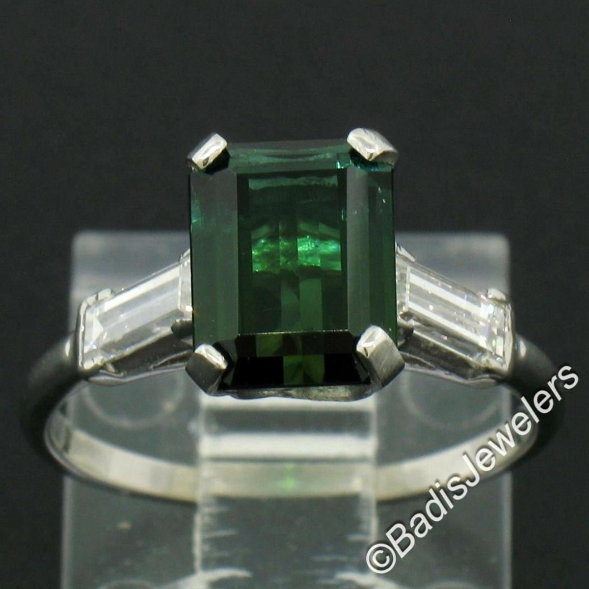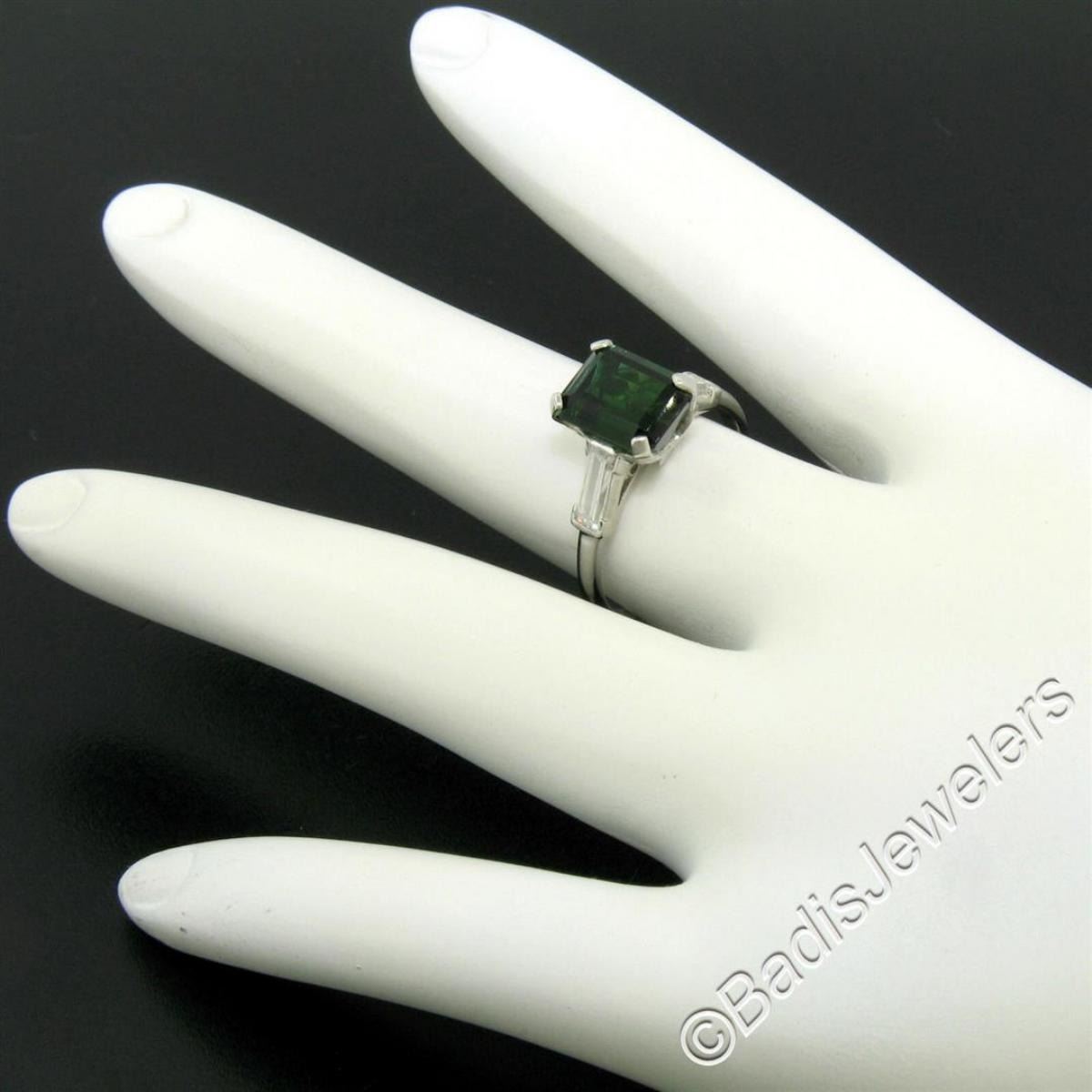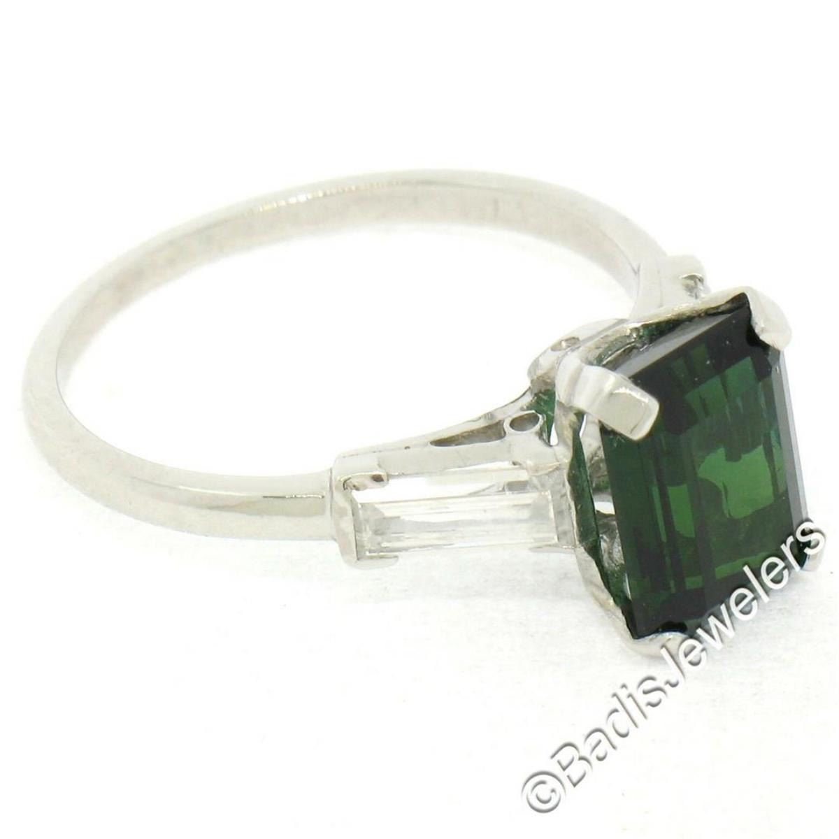A vintage 18kt white gold ring featuring a 2.12ct emerald cut green tourmaline solitaire prong set between a pair of channel set straight baguette cut diamonds (E - VS1) totaling an additional 0.50 ctw. The ring is size 6.0, weighs a total of 3.28 grams, and measures 9.15mm wide.