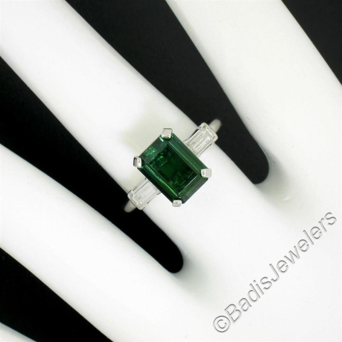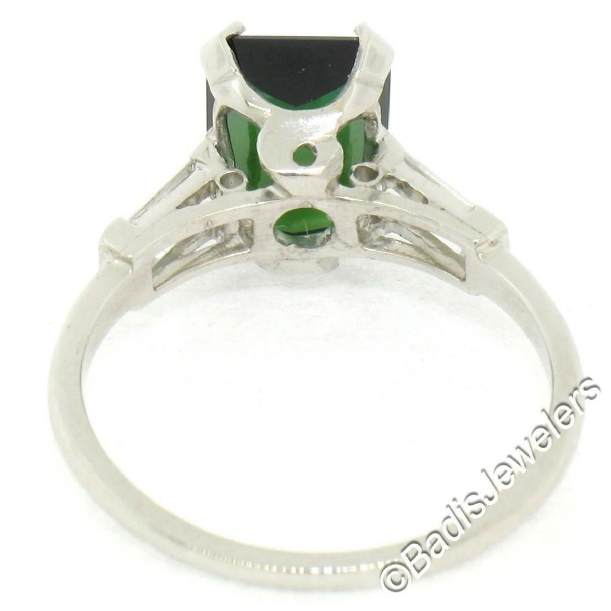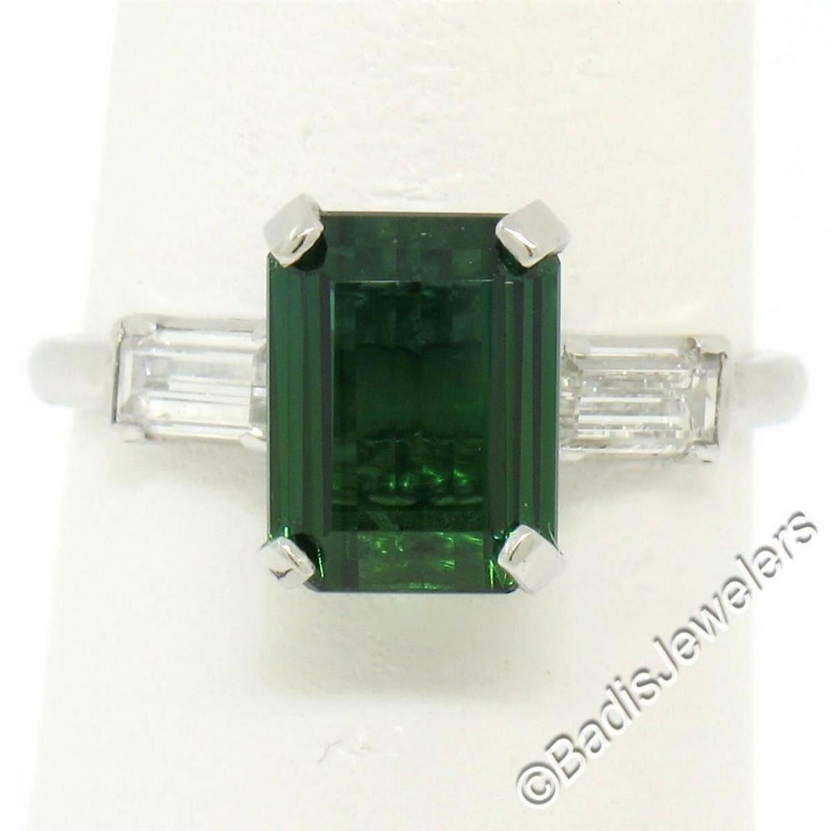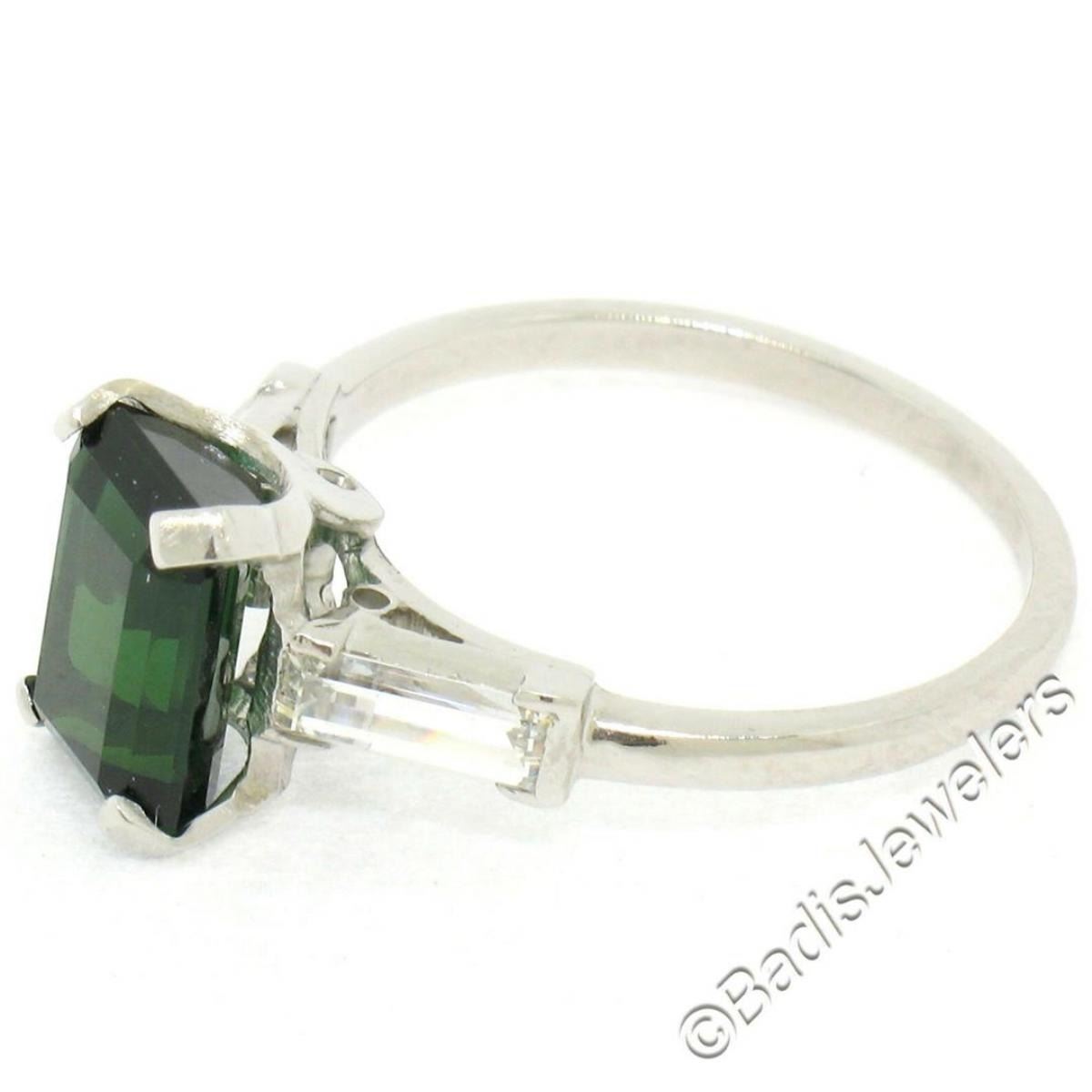 A vintage 18kt white gold ring featuring a 2.12ct emerald cut green tourmaline solitaire prong set between a pair of channel set straight baguette cut diamonds (E - VS1) totaling an additional 0.50 ctw. The ring is size 6.0, weighs a total of 3.28 grams, and measures 9.15mm wide.