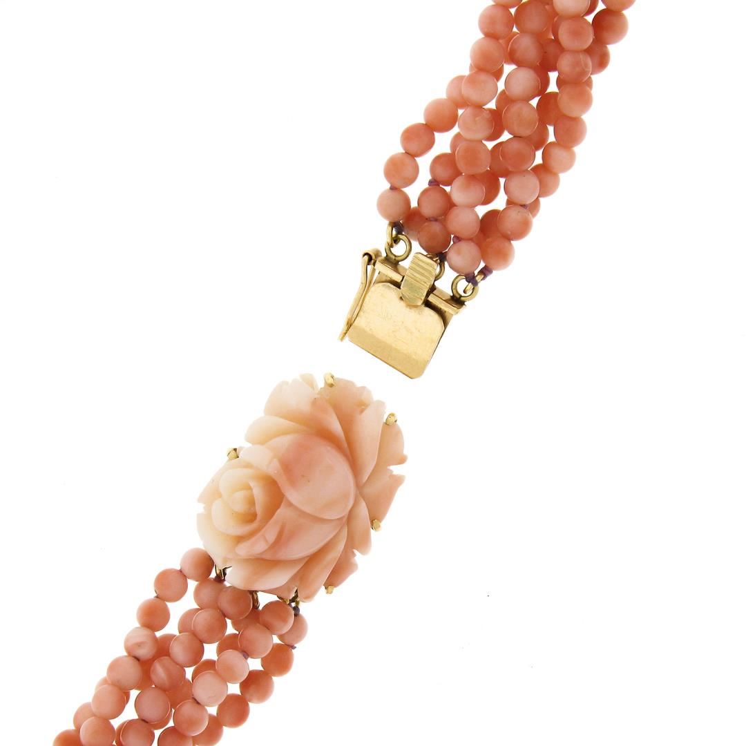 A vintage multi strand torsade necklace with 14k yellow gold clasp, featuring numerous of round bead shape natural corals (3.5-3.6mm), and 1 carved floral shape natural coral (24.5 x 18.2mm). It weighs a total of 76.31 grams, measures 13.4mm wide, and measures 24 inches in length.