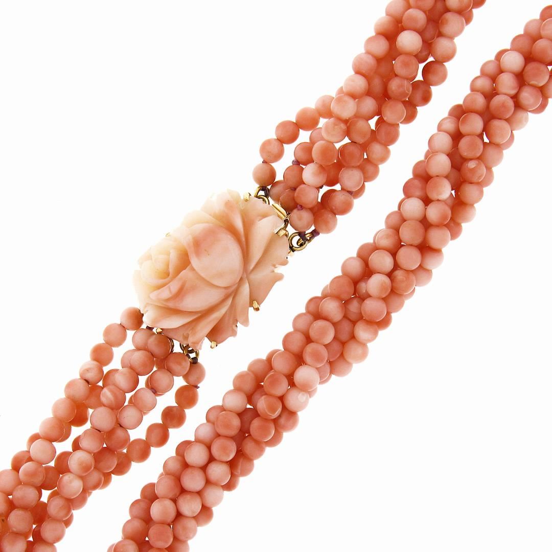 A vintage multi strand torsade necklace with 14k yellow gold clasp, featuring numerous of round bead shape natural corals (3.5-3.6mm), and 1 carved floral shape natural coral (24.5 x 18.2mm). It weighs a total of 76.31 grams, measures 13.4mm wide, and measures 24 inches in length.