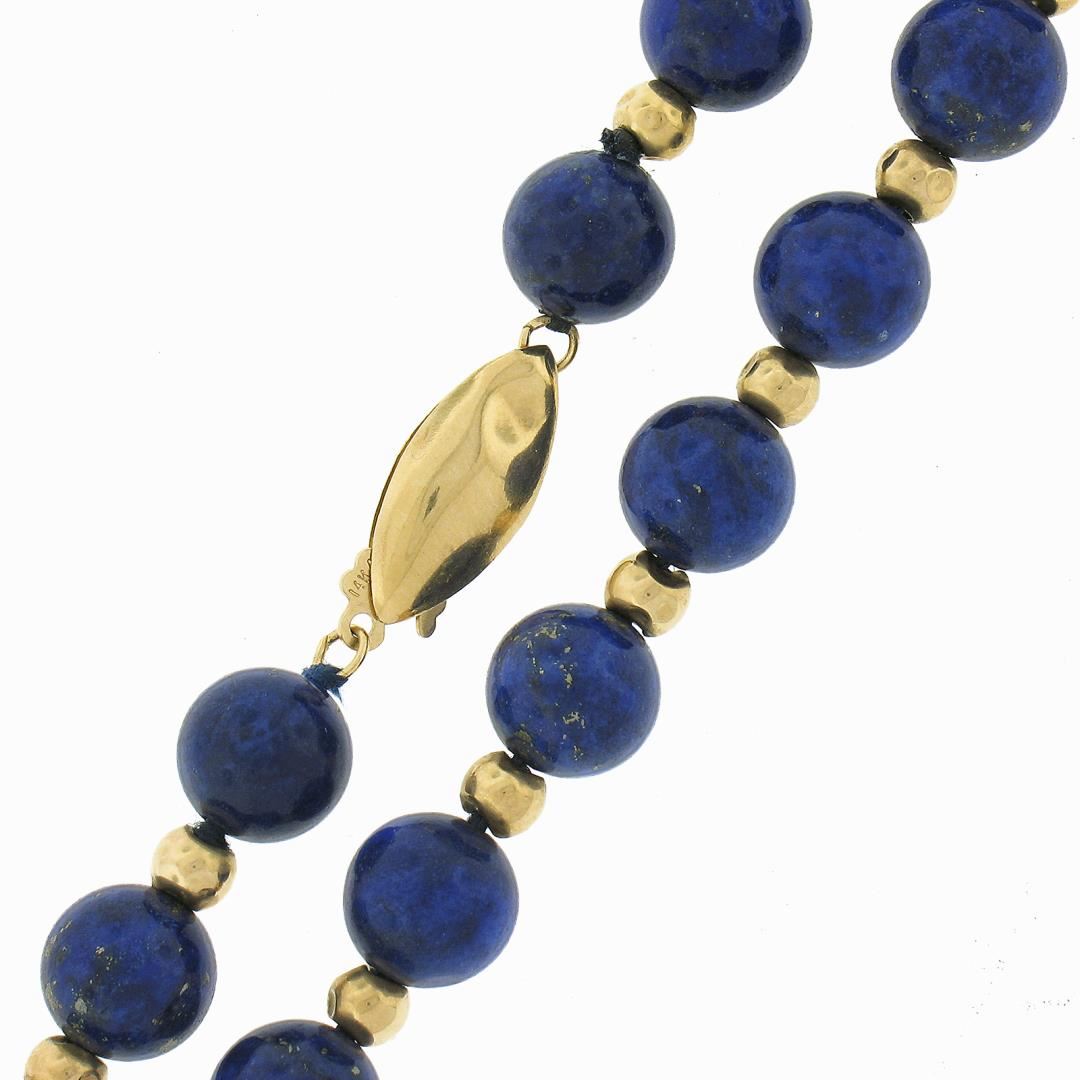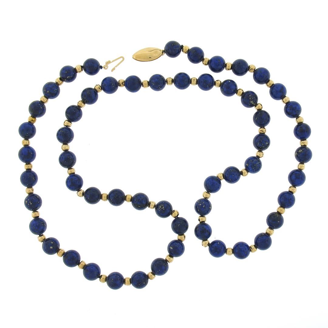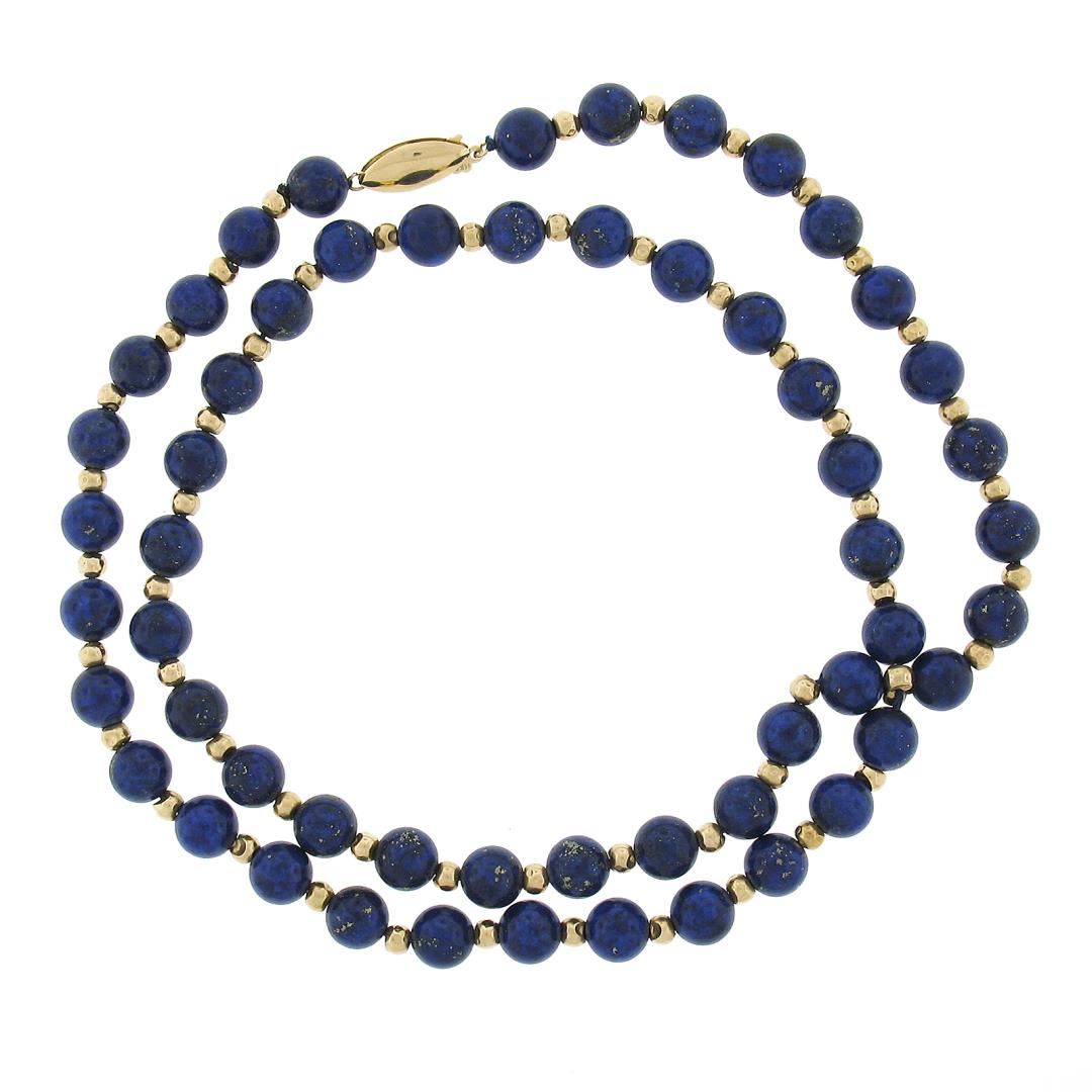 A vintage strand necklace with 14k yellow gold balls & clasp, featuring 55 round bead shape natural lapis (8.2mm). It weighs a total of 47.7 grams, measures 8.2mm wide, and measures 25 inches in length.