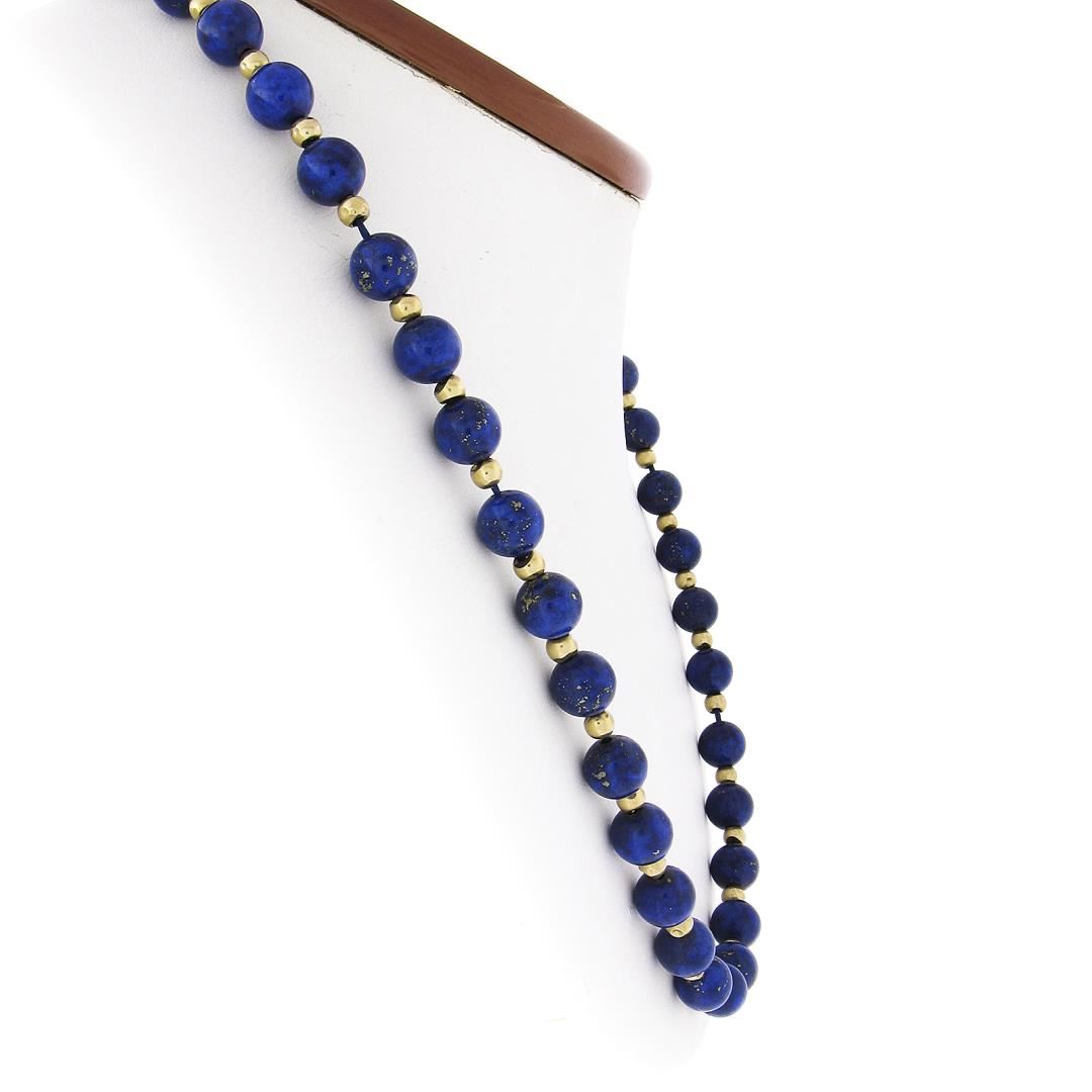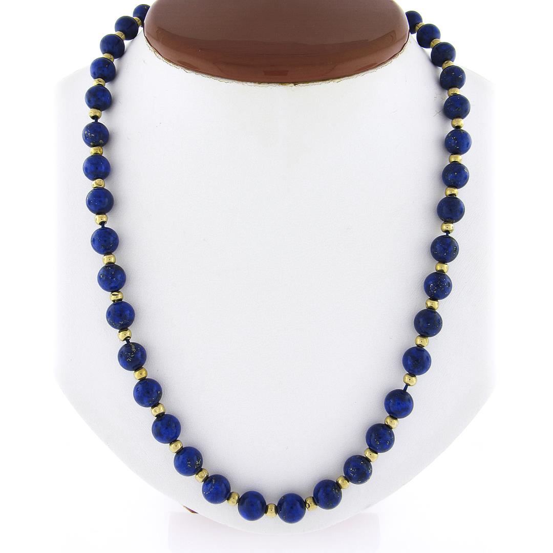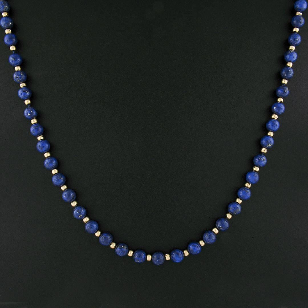 A vintage strand necklace with 14k yellow gold balls & clasp, featuring 55 round bead shape natural lapis (8.2mm). It weighs a total of 47.7 grams, measures 8.2mm wide, and measures 25 inches in length.