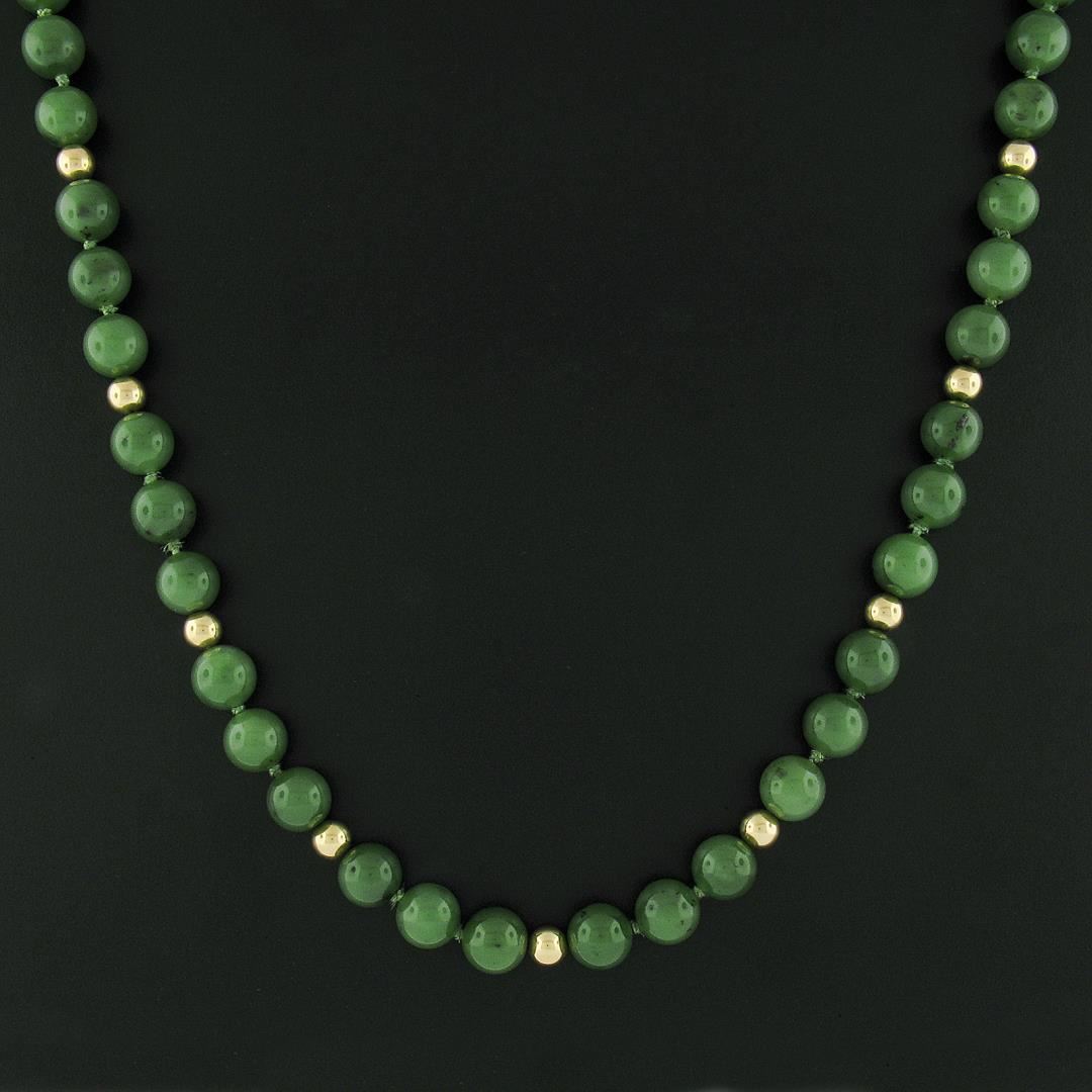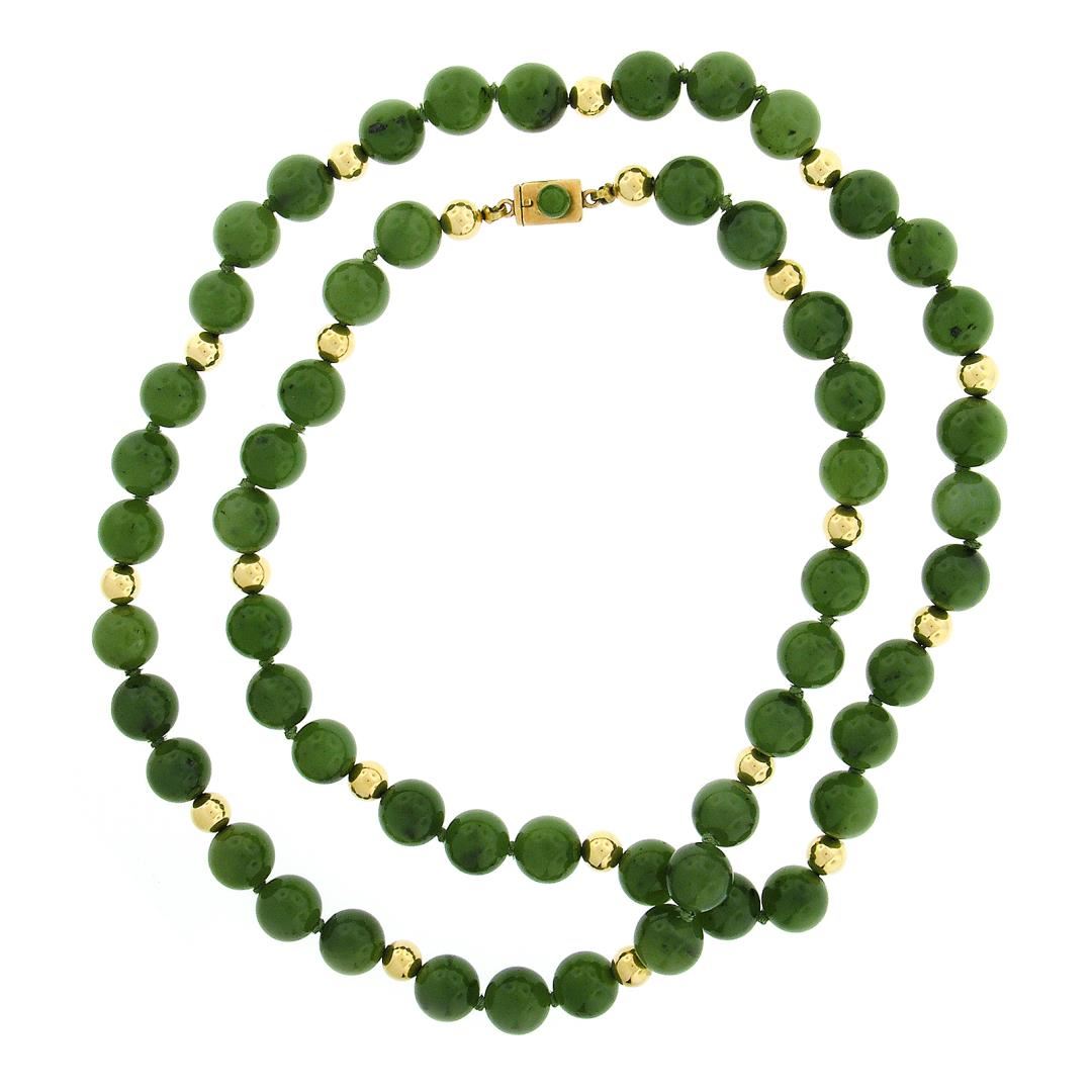 A vintage solid 14k yellow gold bead strand necklace, with 56 GIA graded round bead shape natural nephrite jade ((55) 9.77-10.3+mm each & (1) 5.1mm). It weighs a total of 95.50 grams, measures 10.3mm wide, and measures 29 inches in length. Comes with all original relevant certifications.