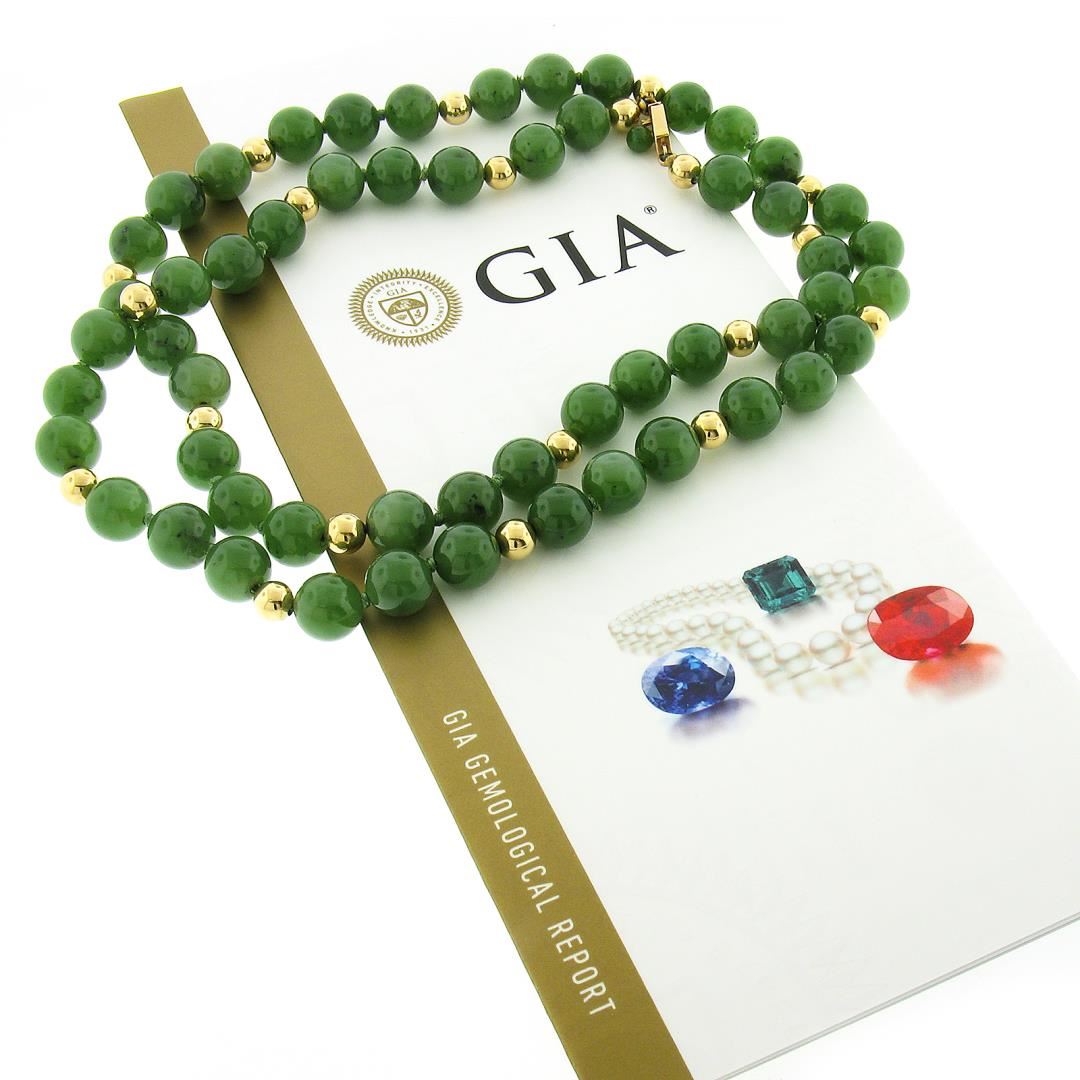 A vintage solid 14k yellow gold bead strand necklace, with 56 GIA graded round bead shape natural nephrite jade ((55) 9.77-10.3+mm each & (1) 5.1mm). It weighs a total of 95.50 grams, measures 10.3mm wide, and measures 29 inches in length. Comes with all original relevant certifications.
