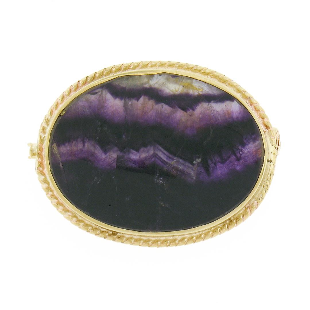 A solid 9k yellow gold pin brooch, with 1 oval shape natural amethyst (25.1x18.5mm). Measures 21.80x28mm and weighs a total of 7.21 grams.