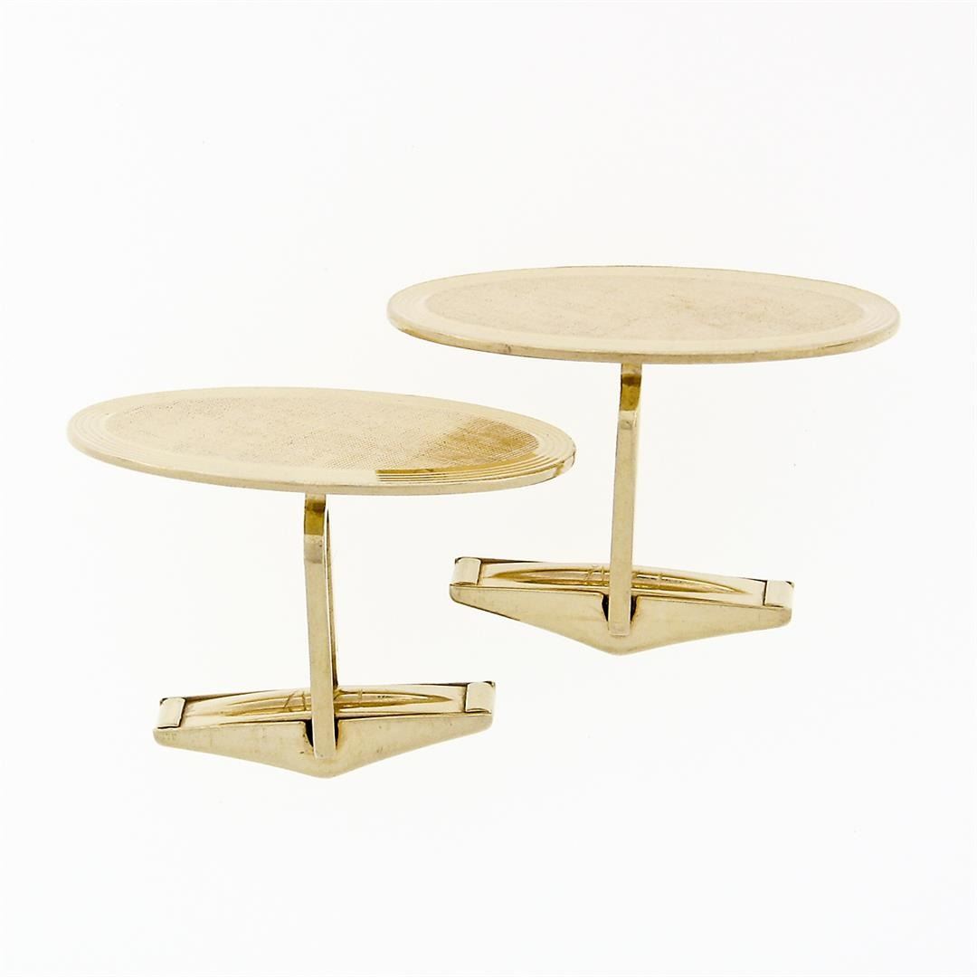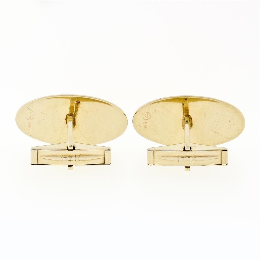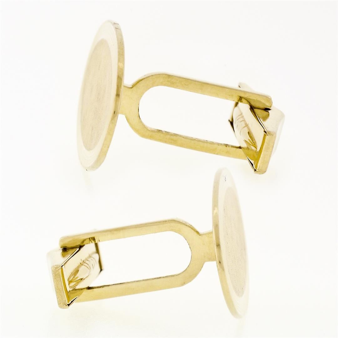 A vintage solid 14k yellow gold cufflinks. These cuff links have a swivel design with a clearance of 13.10mm, weigh a total of 8.80 grams, and the front panels measure 25.95x13.73mm.