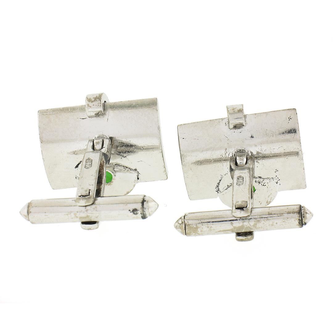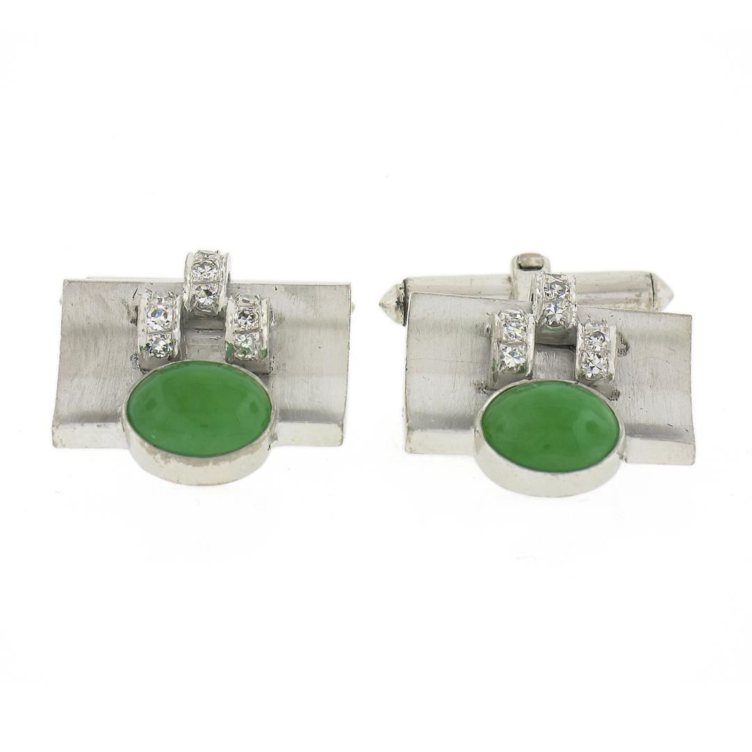 A vintage solid 14k white gold cufflinks by Astor, with 2 oval cabochon cut natural jades (8.3x6.9mm each). and 16 old single cut natural diamonds (G-H - VS2-SI1 ; 0.32ctw). These cuff links have a swivel design with a clearance of 12.8mm, weigh a total of 17.17 grams, and the front panels measure 16.9x18.2mm.