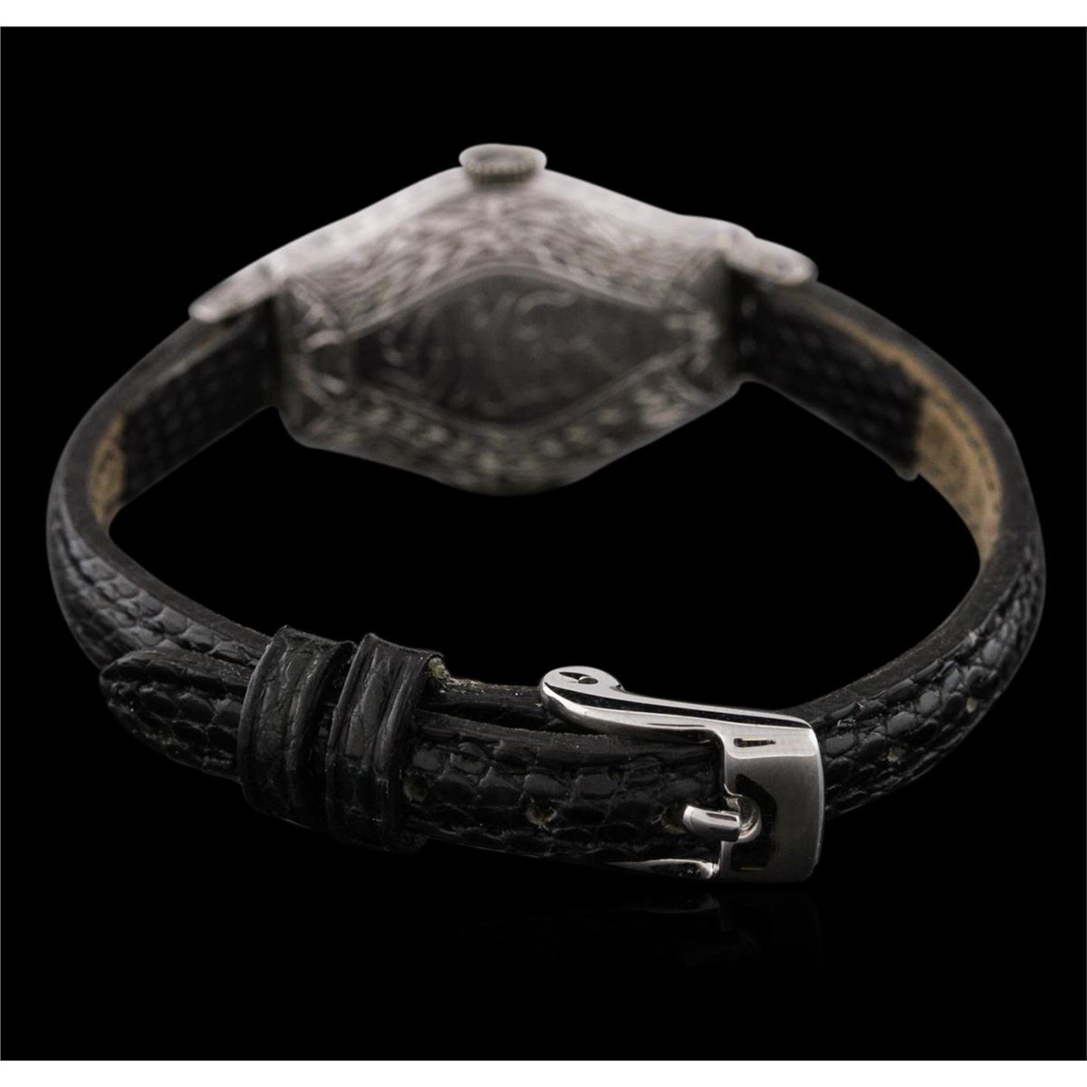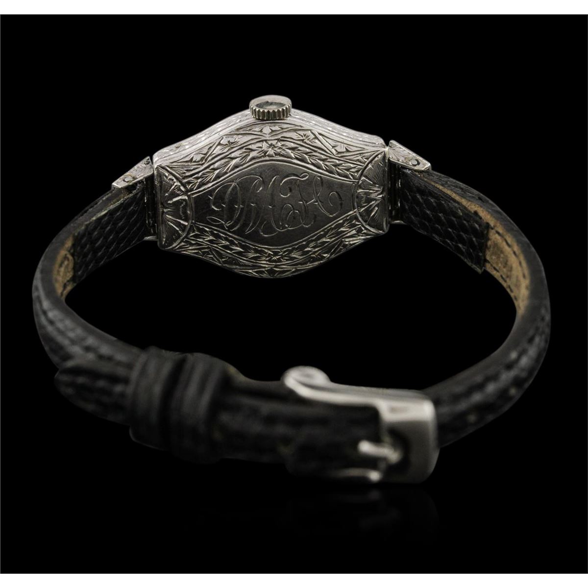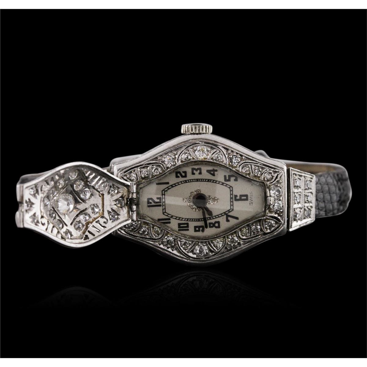 One ladies, vintage Baume & Mercier Case Cover diamond wristwatch electronically tested, platinum, Case: 26mm x 20mm, Case Back: space available for engraving, currently engraved in script with initials, the engraving area is framed by an elaborate patterned finish, Crown: scalloped, Bezel: diamond set, Case Cover: diamond set, Case Lugs: diamond set, Crystal: domed acrylic. Baume & Mercier Swiss Movement: seventeen jewel unadjusted mechanical, Dial: Ivory color, with Blue Steel pointed hands, & numerals, Bracelet: saddle stitched leather strap, Condition: G-4 Average. Bright polish, patterned, and milgrain finish, Seven inch length, adjustable. Stainless Steel buckle clasp, with safety chain. Containing: Fifty Six prong set single cut diamonds, approximate. Total Weight of 56 Stones = 0.88ct. Graded in the setting. Clarity: VS-2 to SI-1. Color: G - I. Total Weight of Diamonds 0.88ct. Total Weight of Watch 10.49 grams. AIG Appraised at $6,050.00.