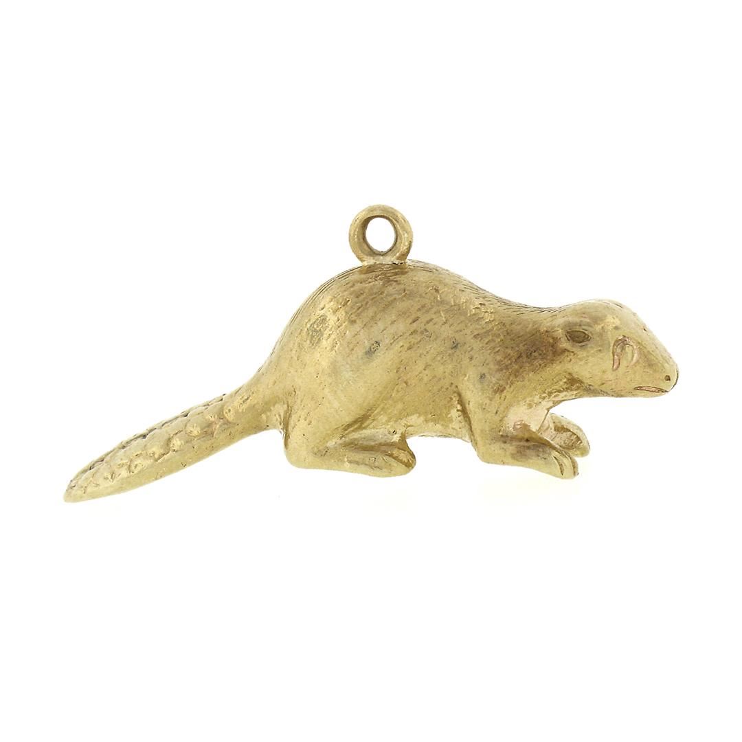 A vintage solid 10k yellow gold 3D beaver charm pendant by Birks. The pendant weighs a total of 5.64 grams, measures 14.45x32.7mm including the bail, and requires jump ring for wear.