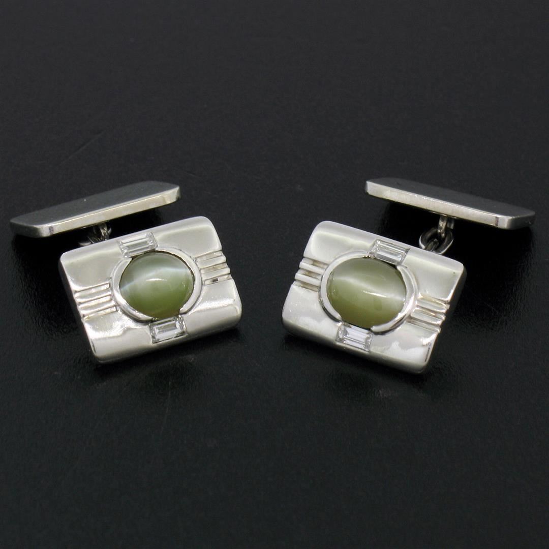A vintage solid platinum and 18k white gold cufflink by Birks, with 2 GIA certified oval cabochon cut natural cat's eye, and 4 baguette cut natural diamonds (G- VS1 ; 0.24ctw). These cuff links have a chain design with a clearance of 13.30mm, weigh a total of 8.82 grams, and the front panels measure 2.60x9.50mm. Comes with all original relevant certifications.