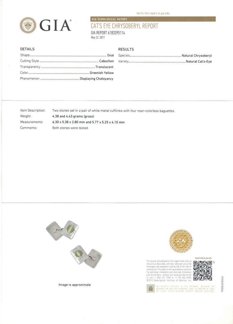 A vintage solid platinum and 18k white gold cufflink by Birks, with 2 GIA certified oval cabochon cut natural cat's eye, and 4 baguette cut natural diamonds (G- VS1 ; 0.24ctw). These cuff links have a chain design with a clearance of 13.30mm, weigh a total of 8.82 grams, and the front panels measure 2.60x9.50mm. Comes with all original relevant certifications.