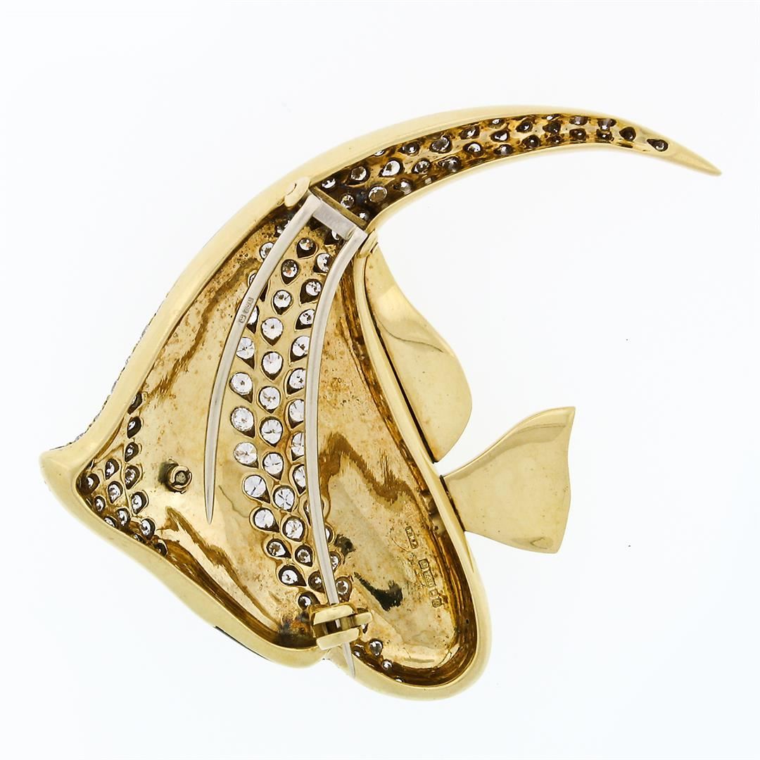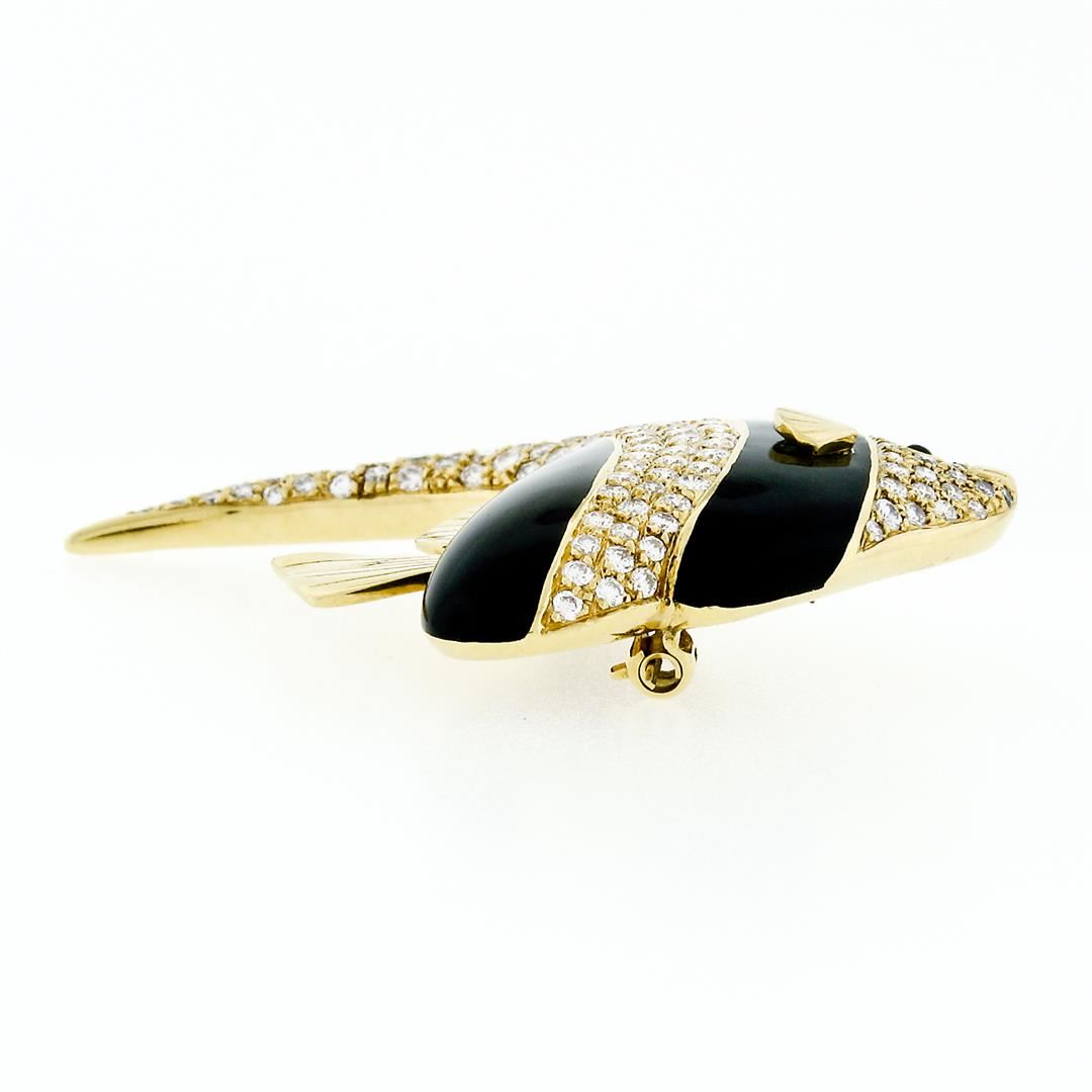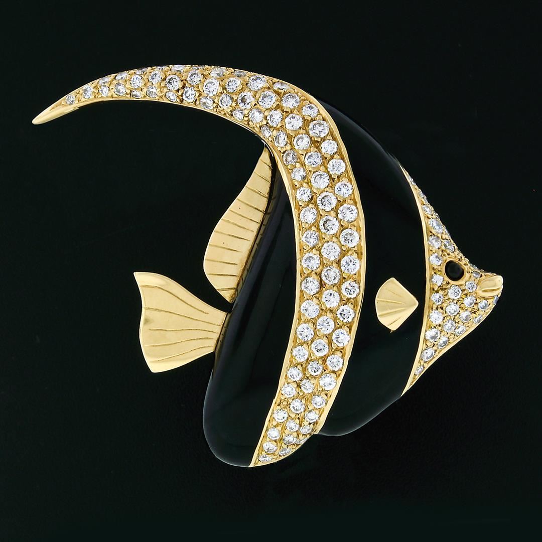 A vintage solid 18k yellow gold fish brooch with black enamel and 114 ideal round brilliant cut natural diamonds (E/F - VVS2/VS1; 3.42ctw). Measures 44.2x53.6mm and weighs a total of 21.63 grams.