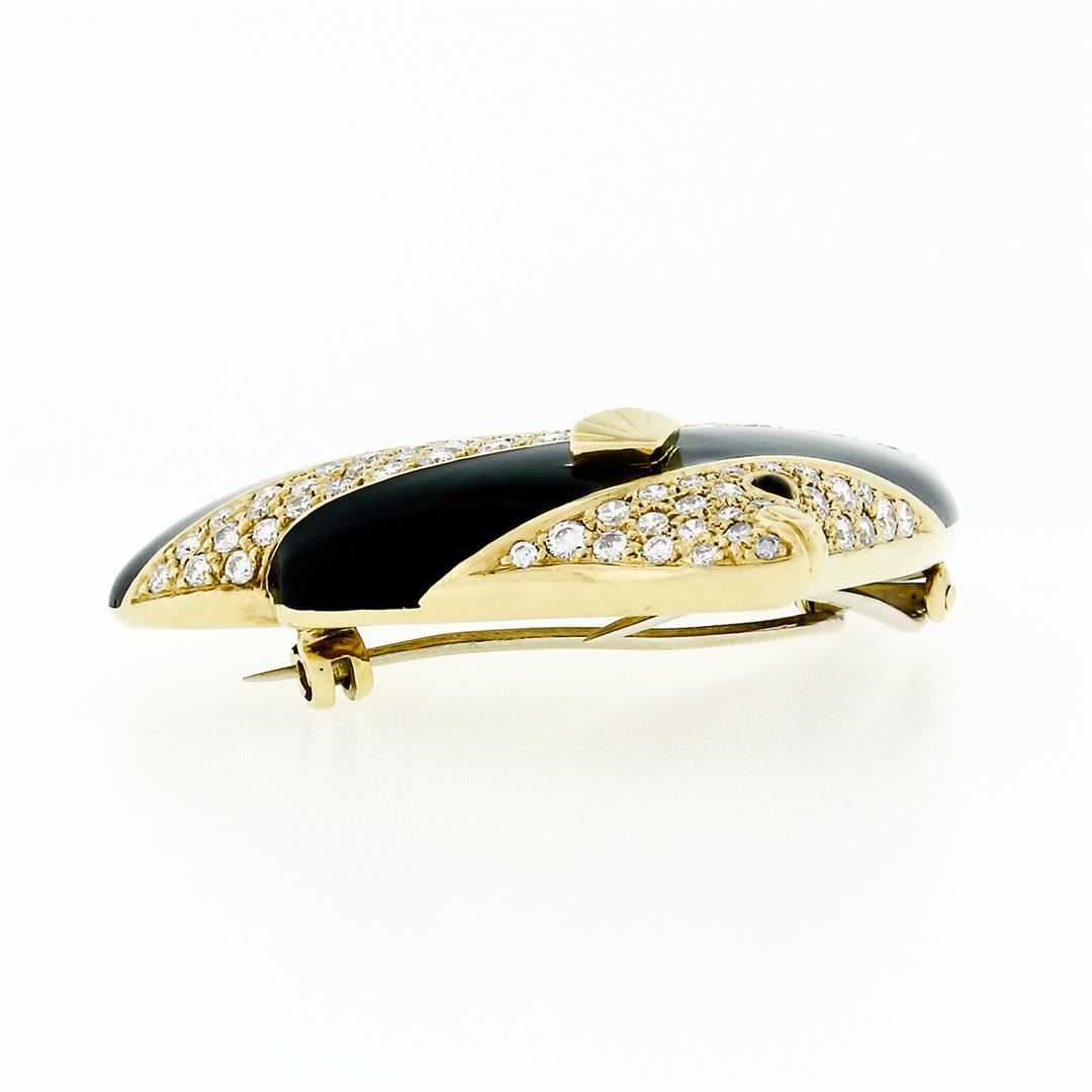 A vintage solid 18k yellow gold fish brooch with black enamel and 114 ideal round brilliant cut natural diamonds (E/F - VVS2/VS1; 3.42ctw). Measures 44.2x53.6mm and weighs a total of 21.63 grams.