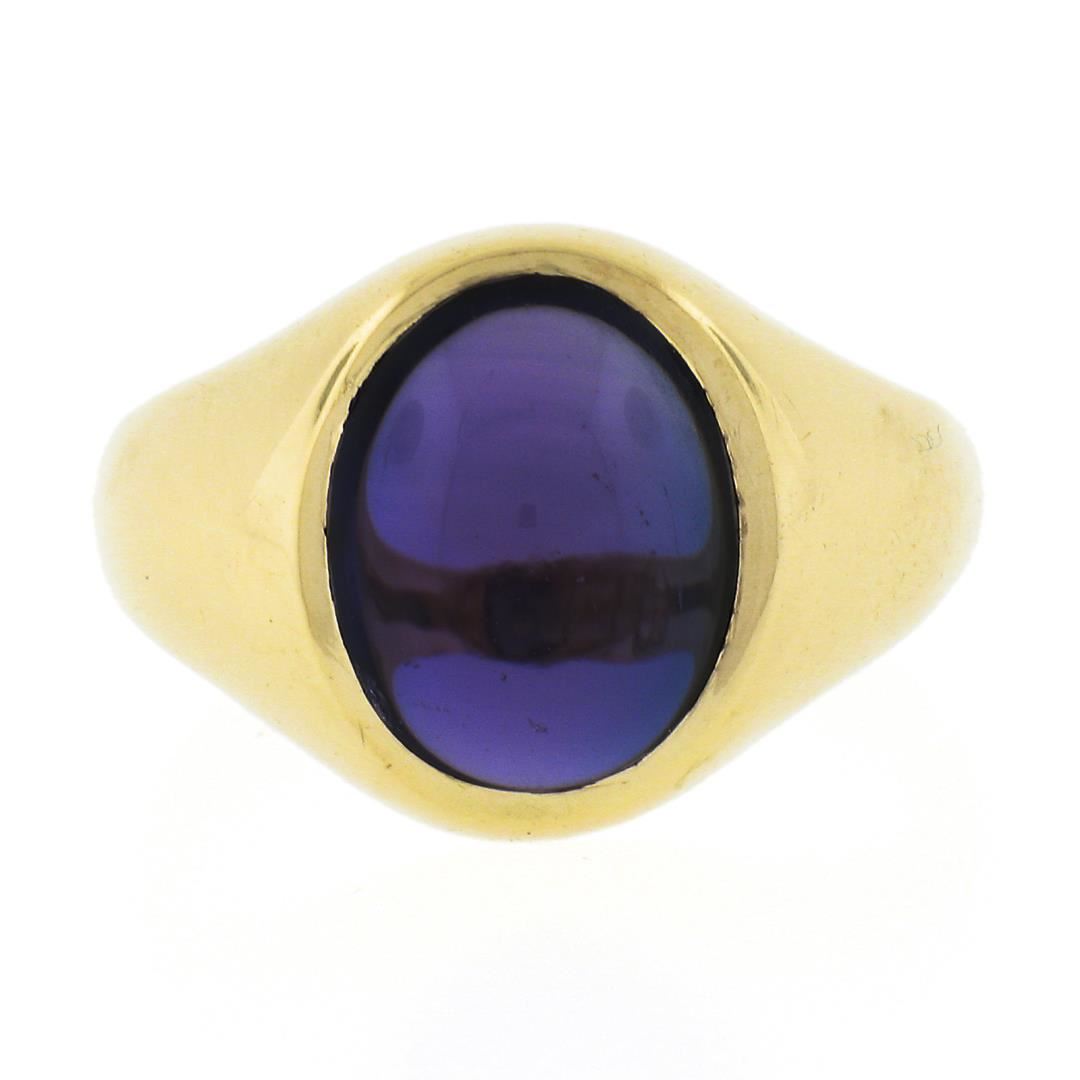 A vintage solid 9k yellow gold solitaire ring, with 1 oval cabochon cut natural amethyst (9.6x7.6mm). The ring is size 4.5, weighs a total of 2.82 grams, and measures 11.8mm wide.