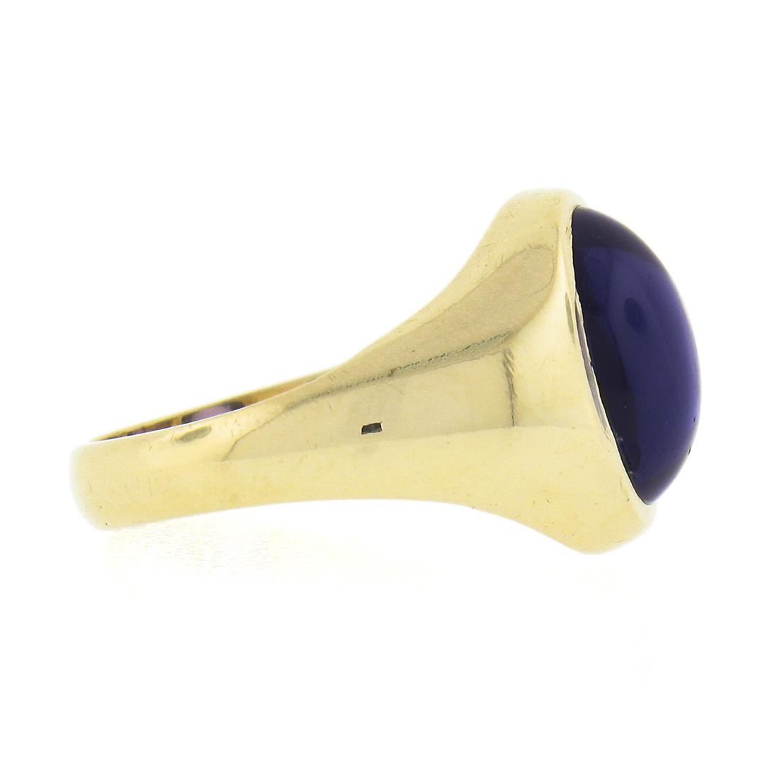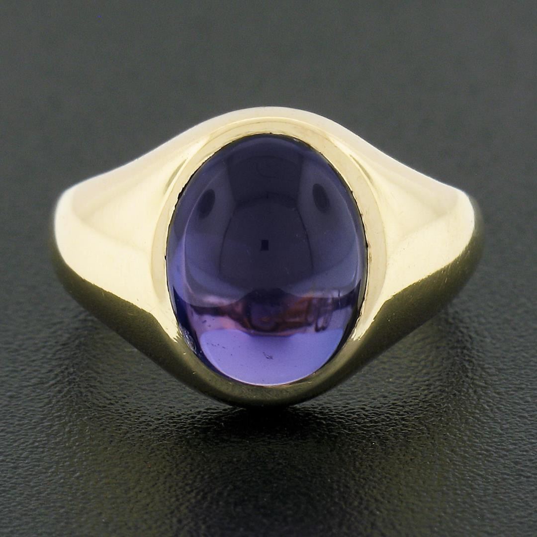 A vintage solid 9k yellow gold solitaire ring, with 1 oval cabochon cut natural amethyst (9.6x7.6mm). The ring is size 4.5, weighs a total of 2.82 grams, and measures 11.8mm wide.