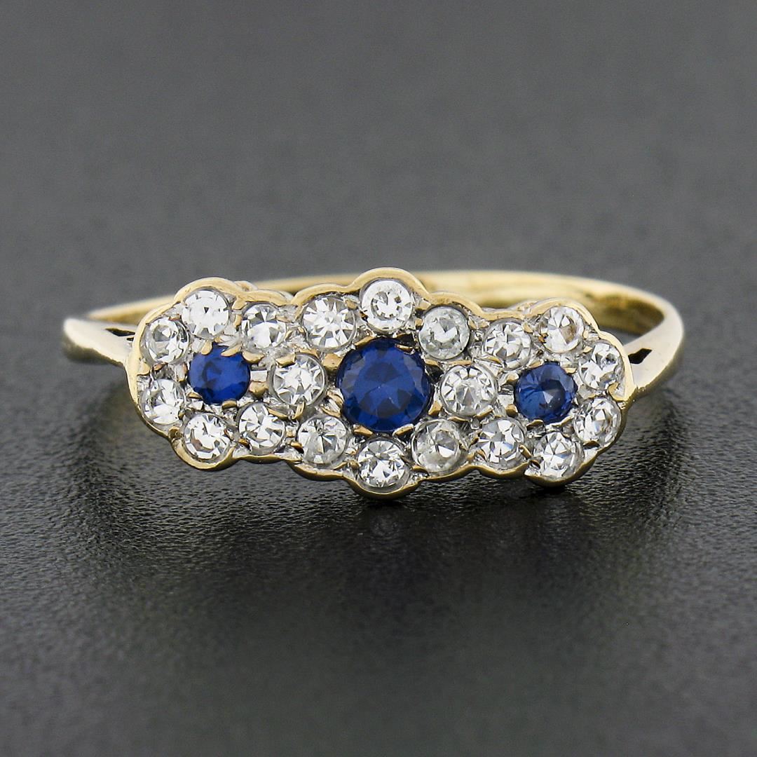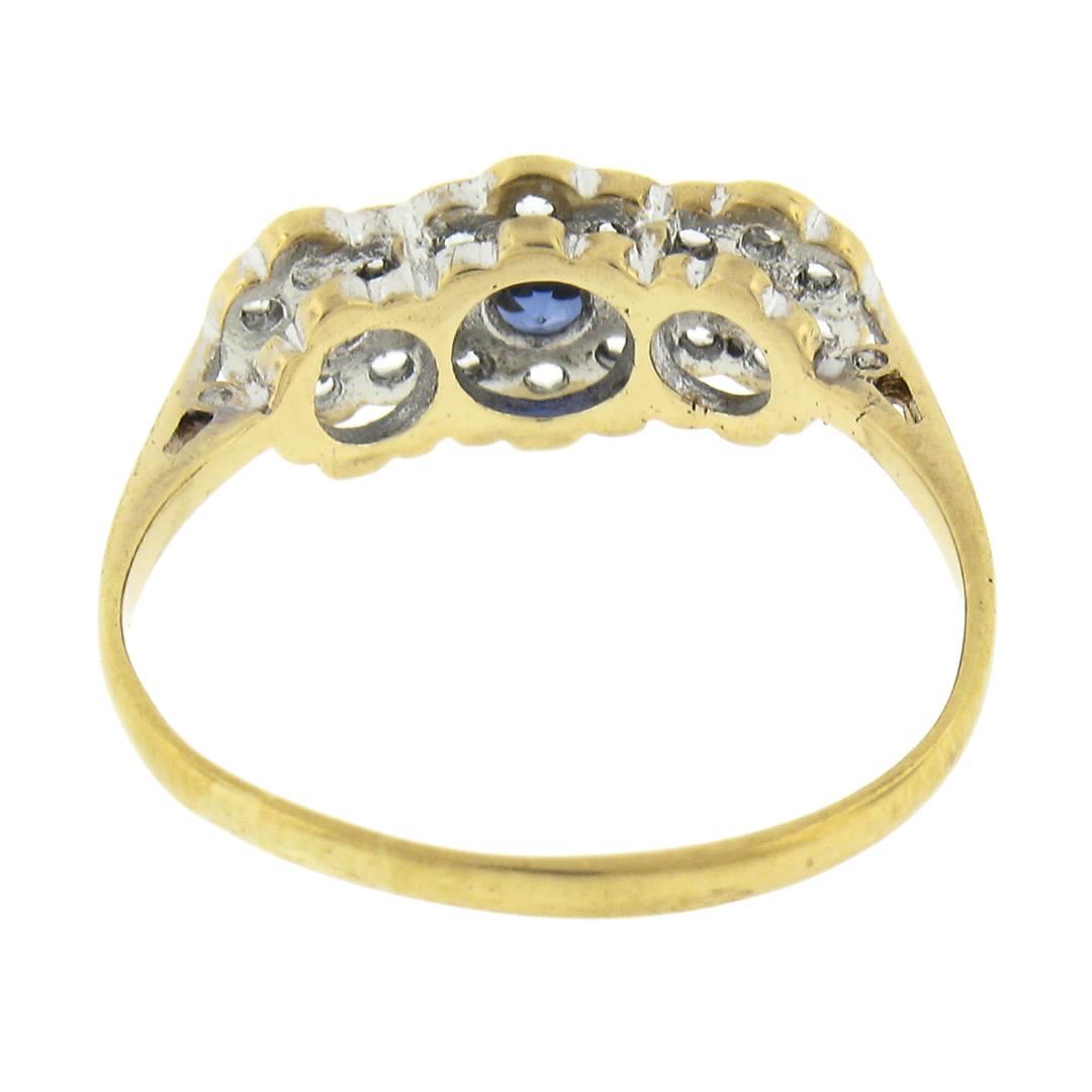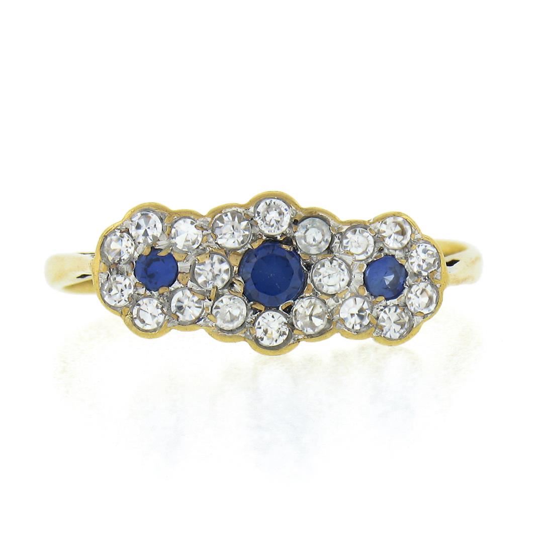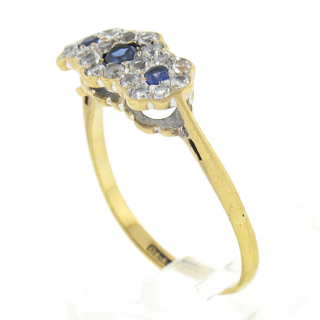 A vintage soldi 9k yellow gold cluster ring, with 3 single cut blue cubic zirconia & 20 single cut cubic zirconia. The ring is size 7.5, weighs a total of 1.69 grams, and measures 7.1mm wide.