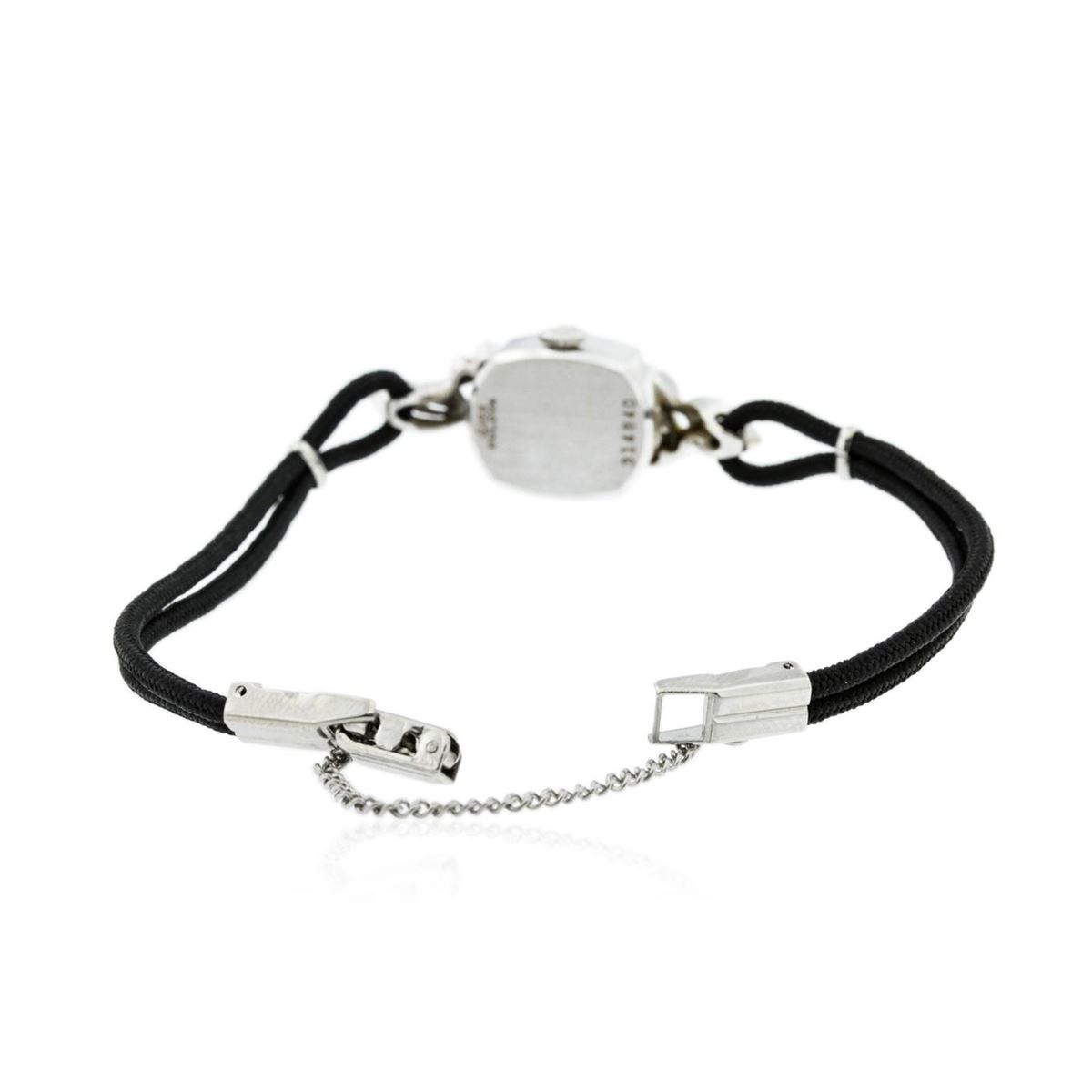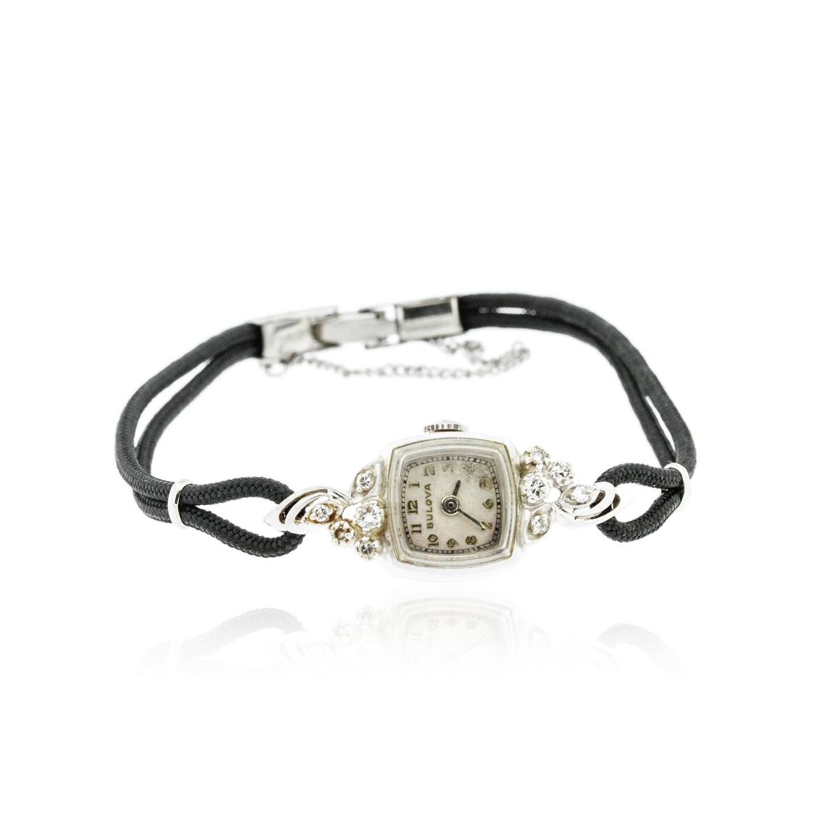 One ladies, vintage Bulova diamond wristwatch electronically tested, 14KT white gold, Case: 17.80mm x 14.00mm, Crown: scalloped, Bezel: polished, Case Lugs: diamond set, Crystal: domed acrylic. Wittnauer Swiss Movement: seventeen jewel unadjusted mechanical, Dial: Ivory color, with baton pointed hands, & numerals, Bracelet: double Black cord, Condition: G-4 Average. Bright polish finish, Seven and one half inch length. Stainless Steel over locking clasp, with safety chain. Containing: Ten bright cut & bead set single cut diamonds, approximate. Total Weight of 10 Stones = 0.20ct. Graded in the setting. Clarity: SI-1 to SI-2. Color: H - I. Total Weight of Diamonds 0.20ct. Total Weight of Watch 10.49 grams. AIG Appraised at $3,150.00.