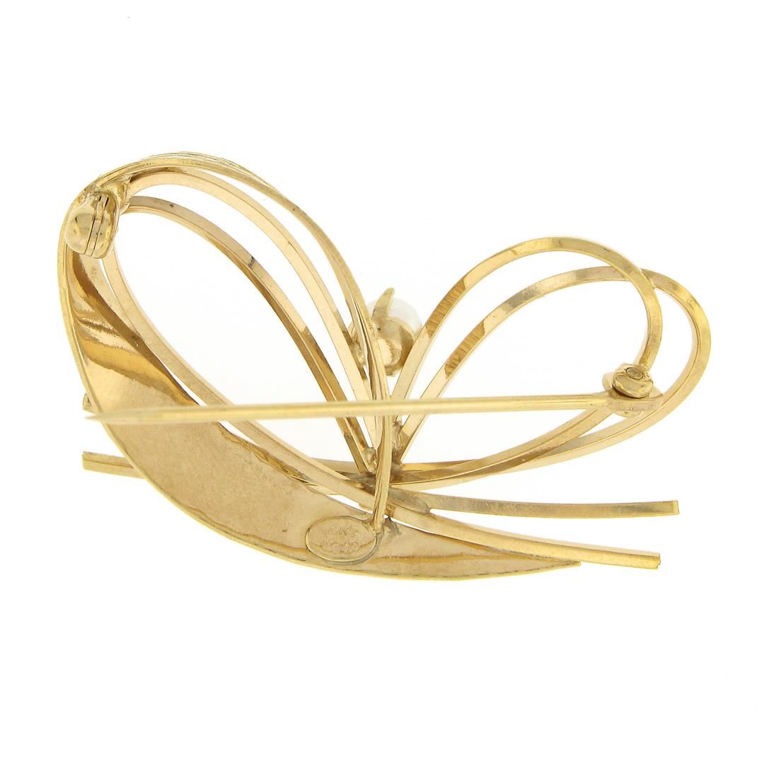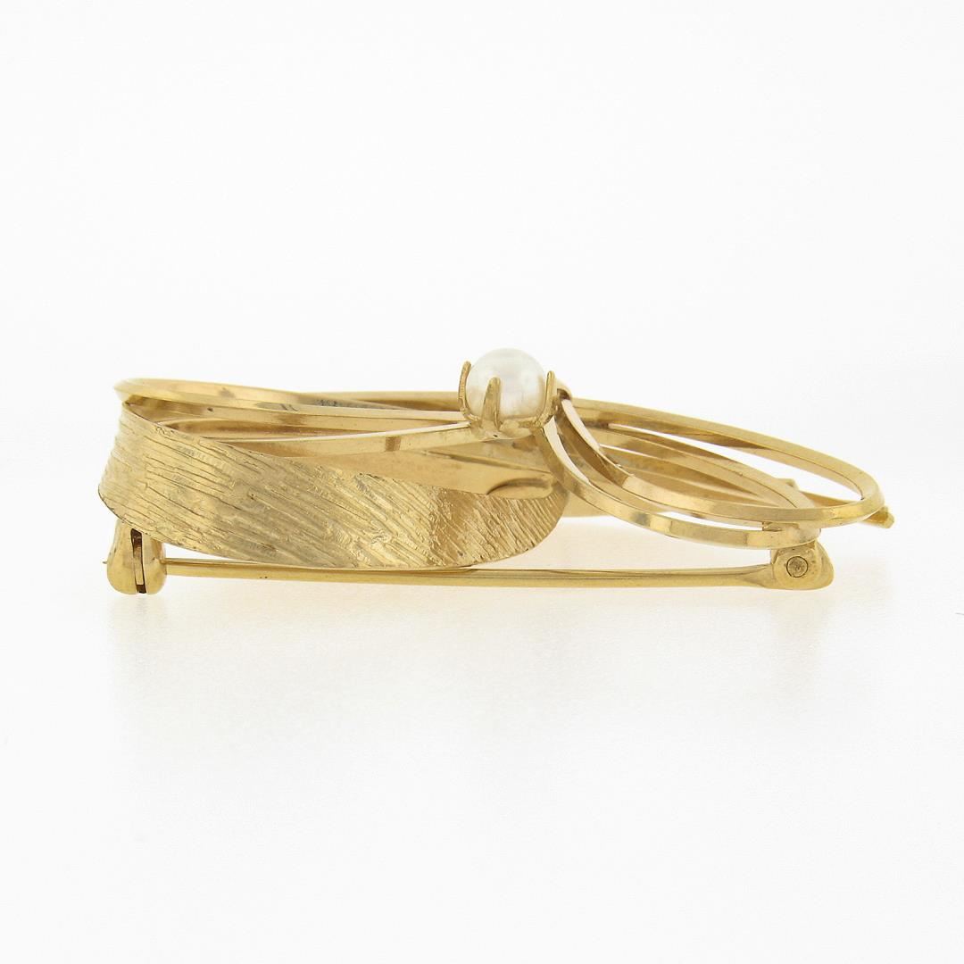 A vintage solid 14k yellow gold pin brooch by Carl Art Inc, with 1 round shape cultured pearl (4.8mm). Measures 29.4x45.7mm and weighs a total of 8.94 grams.