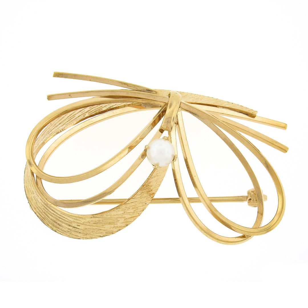 A vintage solid 14k yellow gold pin brooch by Carl Art Inc, with 1 round shape cultured pearl (4.8mm). Measures 29.4x45.7mm and weighs a total of 8.94 grams.