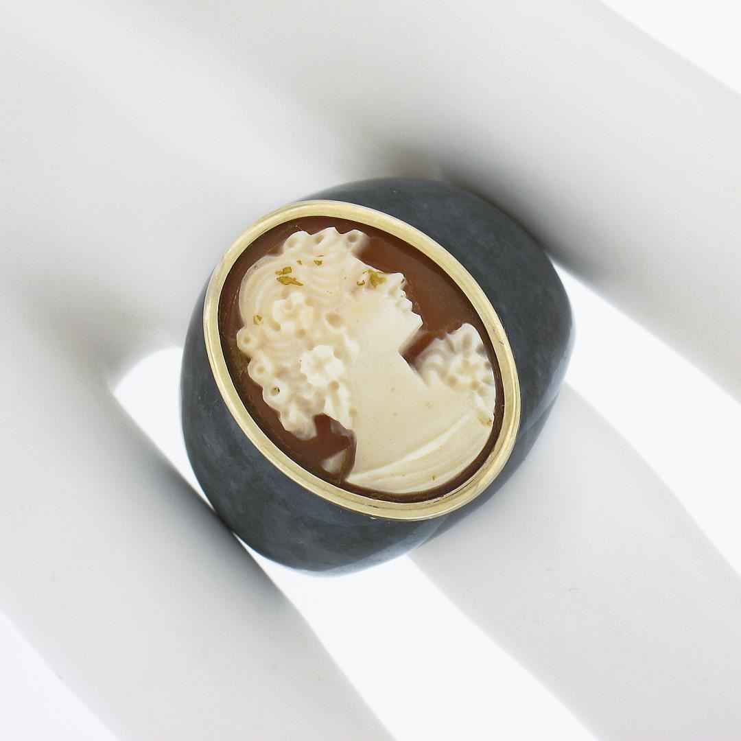 A vintage solid 10k yellow gold ring, with carved black stone, and 1 shell cameo (18.1x13.4mm). The ring is size 9.0, weighs a total of 14.20 grams, and measures 21.2mm wide.