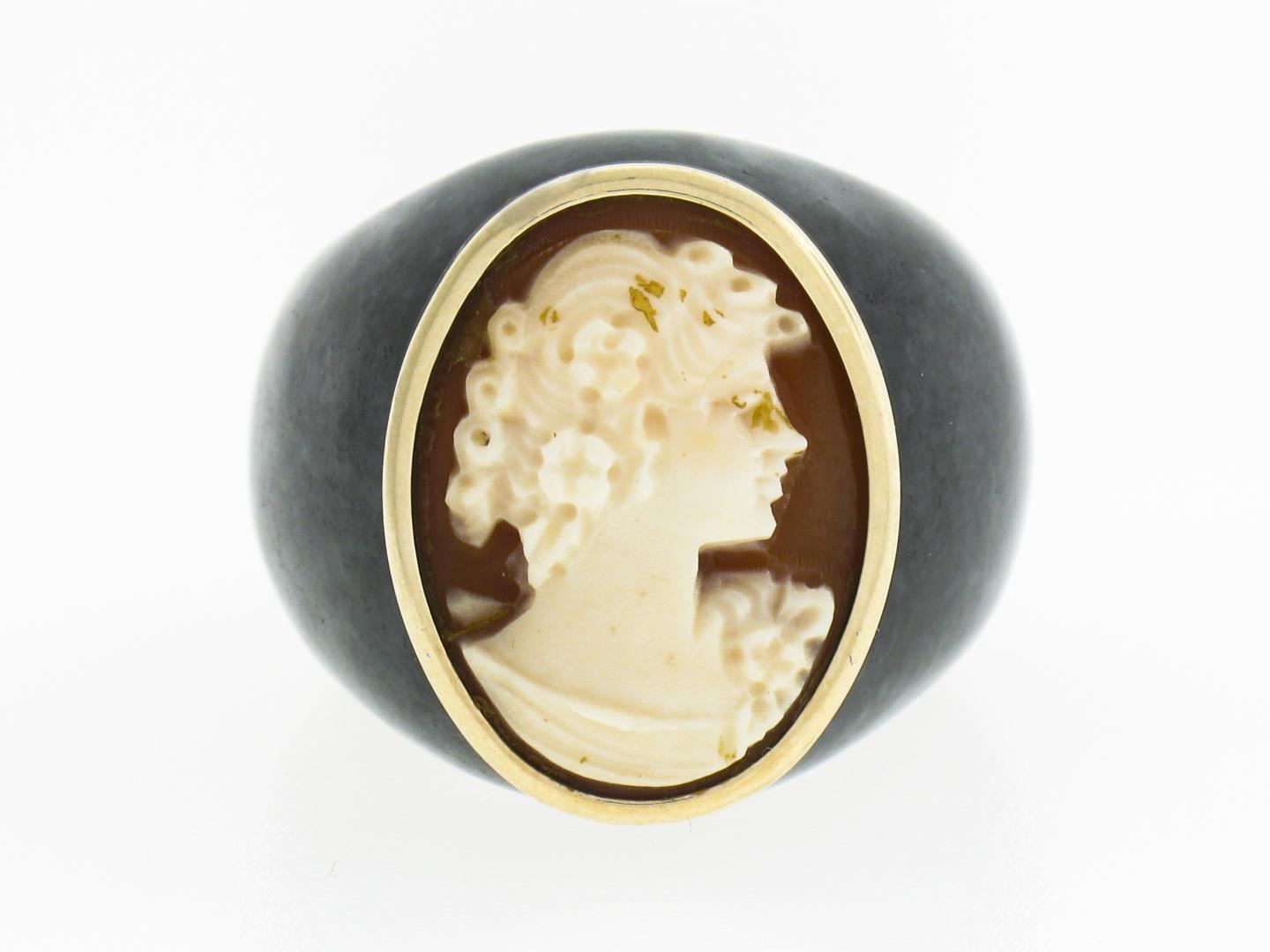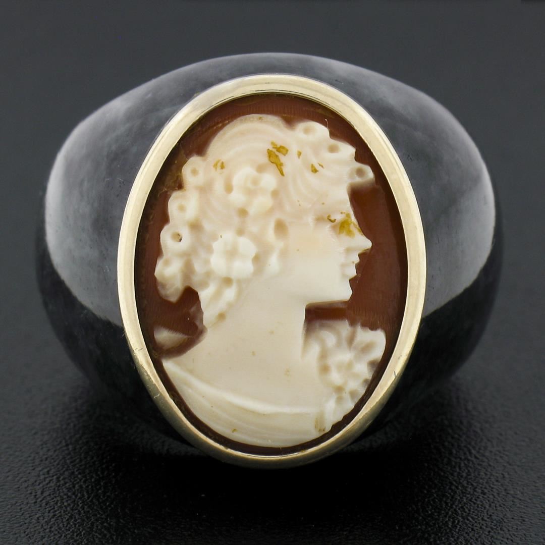 A vintage solid 10k yellow gold ring, with carved black stone, and 1 shell cameo (18.1x13.4mm). The ring is size 9.0, weighs a total of 14.20 grams, and measures 21.2mm wide.