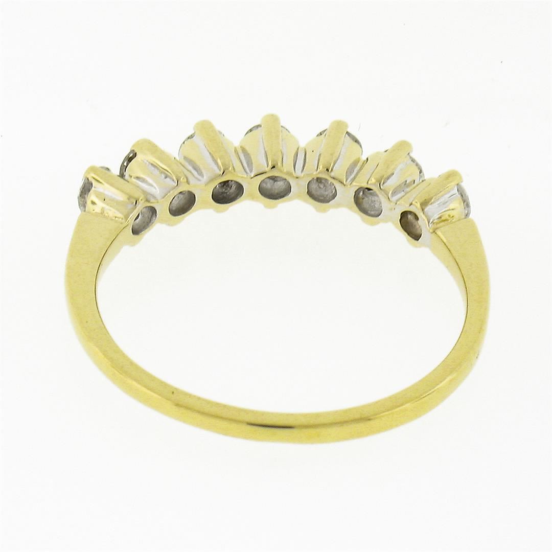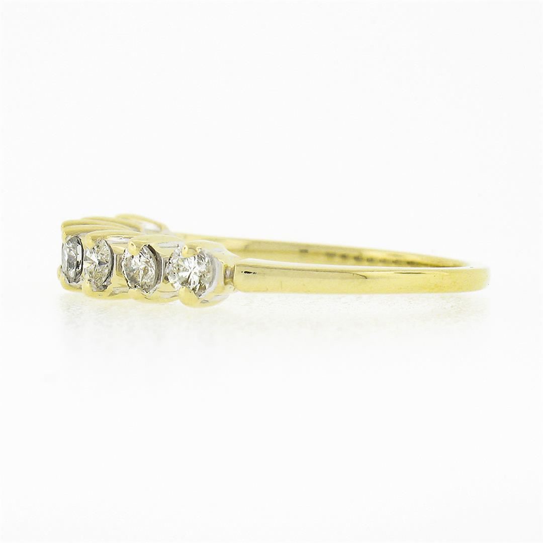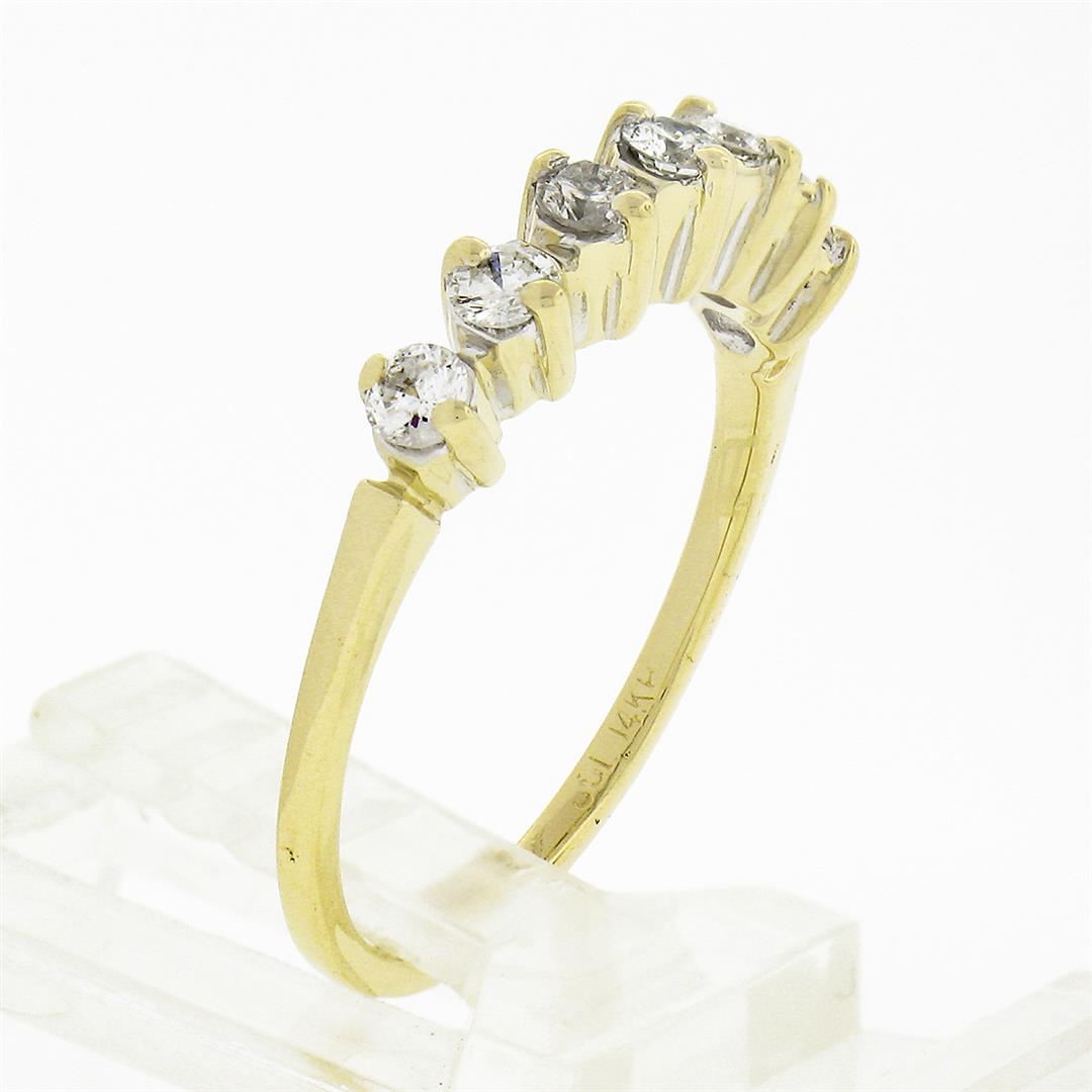 A solid 14k yellow gold band ring, with 7 round brilliant cut natural diamonds (G/H - SI1/SI2 ; 0.35ctw). The ring is size 6.5, weighs a total of 2.21 grams, and measures 3.5mm wide.