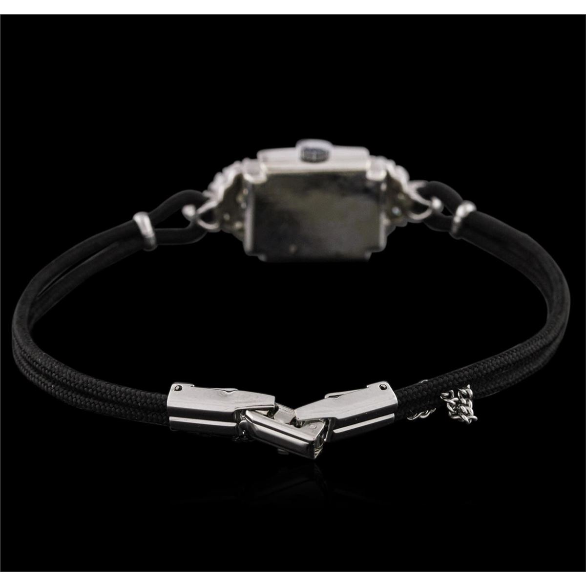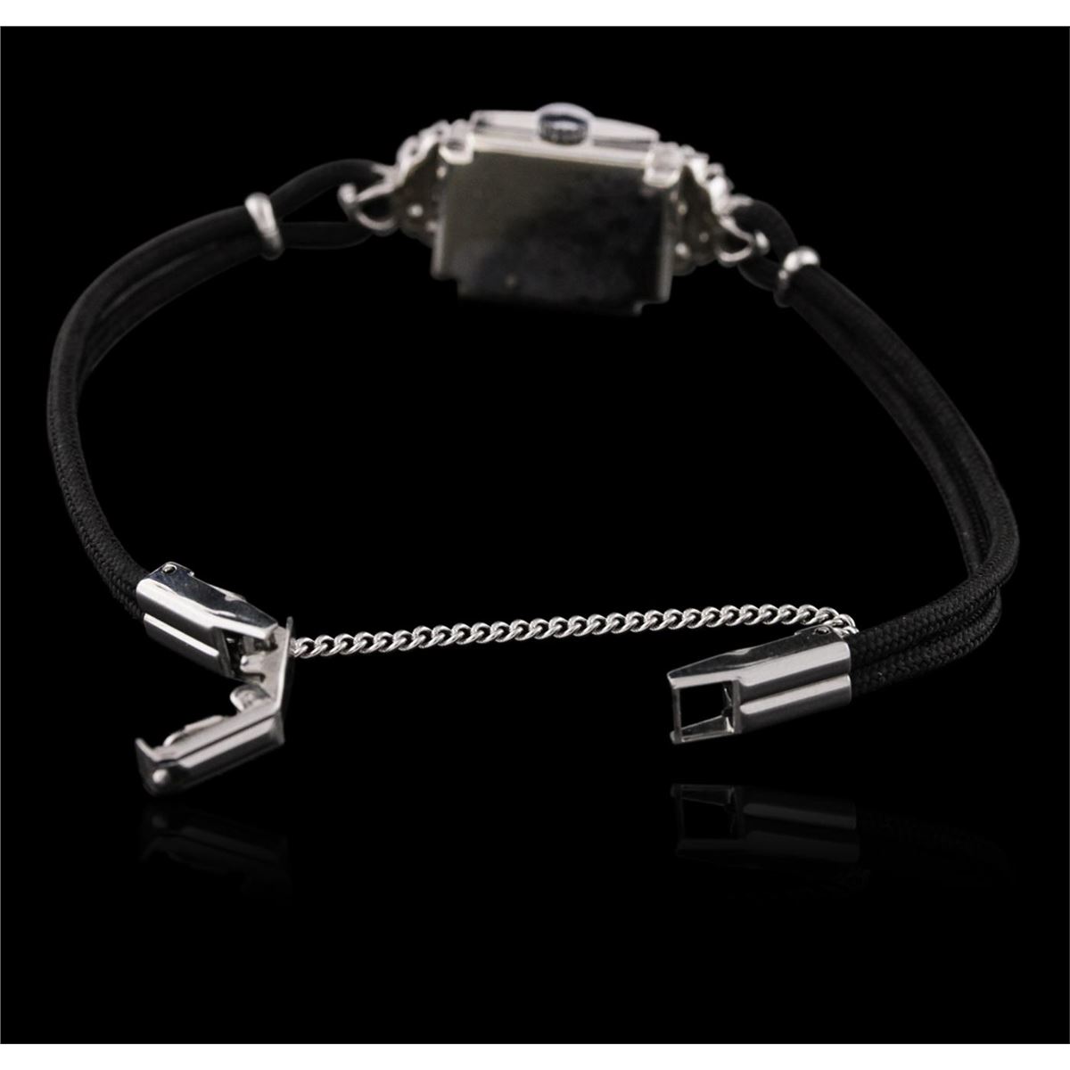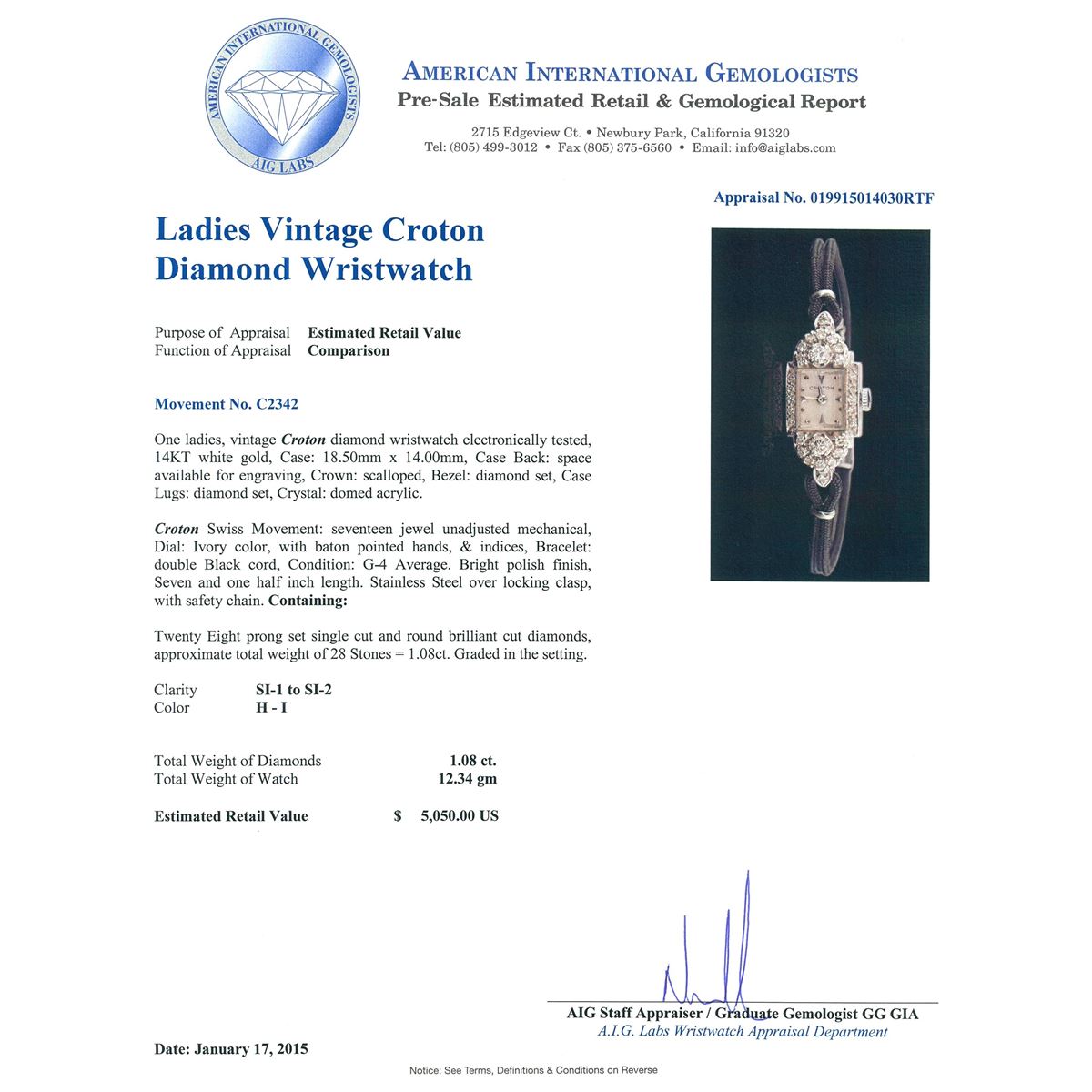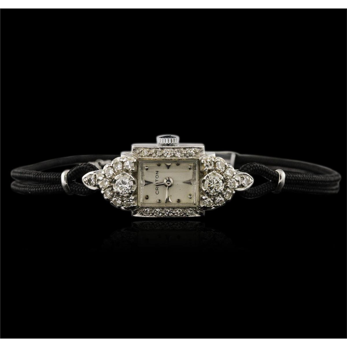 One ladies, vintage Croton diamond wristwatch electronically tested, 14KT white gold, Case: 18.50mm x 14.00mm, Case Back: space available for engraving, Crown: scalloped, Bezel: diamond set, Case Lugs: diamond set, Crystal: domed acrylic. Croton Swiss Movement: seventeen jewel unadjusted mechanical, Dial: Ivory color, with baton pointed hands, & indices, Bracelet: double Black cord, Condition: G-4 Average. Bright polish finish, Seven and one half inch length. Stainless Steel over locking clasp, with safety chain. Containing: Twenty Eight prong set single cut and round brilliant cut diamonds, approximate. Total Weight of 20 Stones = 1.08ct. Graded in the setting. Clarity: SI-1 to SI-2. Color: H - I. Total Weight of Diamonds 1.08ct. Total Weight of Watch 12.34 grams. AIG Appraised at $5,050.00.