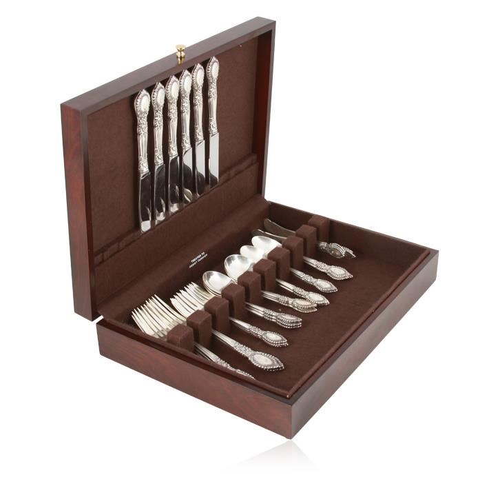 This gorgeous sterling silver service for (6) includes the following pieces: (6) 7.75" dinner forks, (6) 6.25" salad forks, (6) 6.00" soup spoons, (6) 6.00" teaspoons, (6) 9.75" dinner knives (stainless blades), (6) 6.00" solid sterling butter spreaders. Comes in a new mahogany chest. Monogramed in period script with an Old English "C". By Reed & Barton in the Guildhall Pattern Circa 1941.