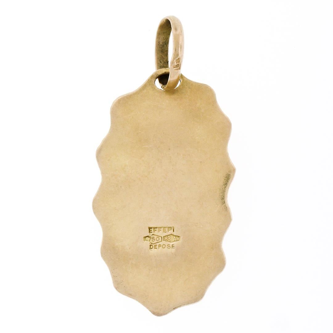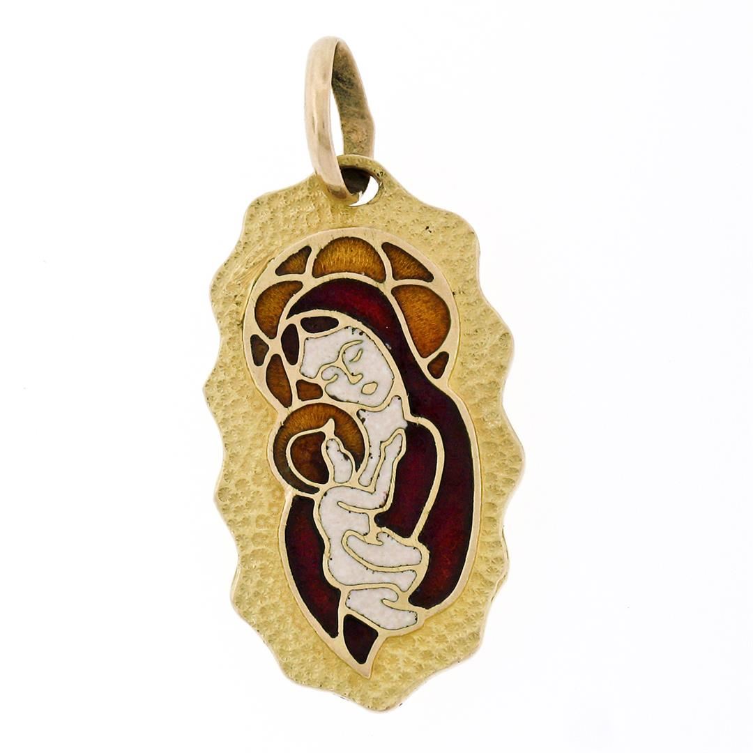Vintage Eftepi Depose 18K Yellow Gold Mosaic Enamel Mother Mary & Jesus Pendant. Please see photos and description for all available information. A vintage solid 18k yellow gold mother mary & jesus pendant by Eftepi Depose, with enamel work. The pendant weighs a total of 5.0 grams, measures 35.0x15.60mm including the bail, and the inside of the bail measures 6.0x4.65mm.